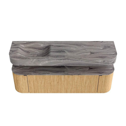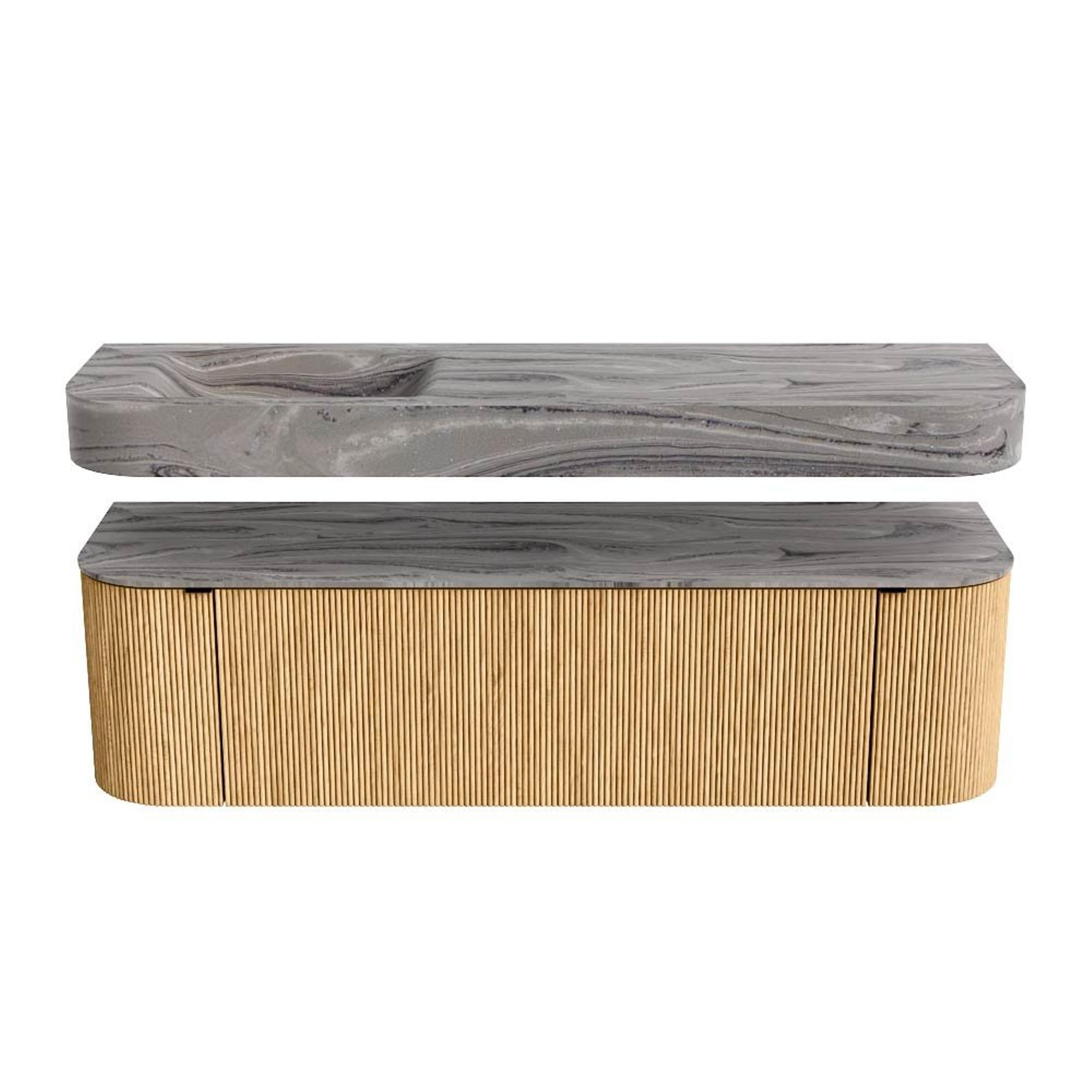Boven het meubel zweeft een bijpassende, vrij hangende wastafel met afgeronde hoeken – perfect afgestemd op de vorm van de kast. De wastafel is uitgevoerd in Solid Surface en volgt subtiel de lijnen van het onderliggende meubel, waardoor een harmonieus geheel ontstaat. Het Solid Surface topblad vormt een sterke, onderhoudsvriendelijke basis en maakt de combinatie compleet.