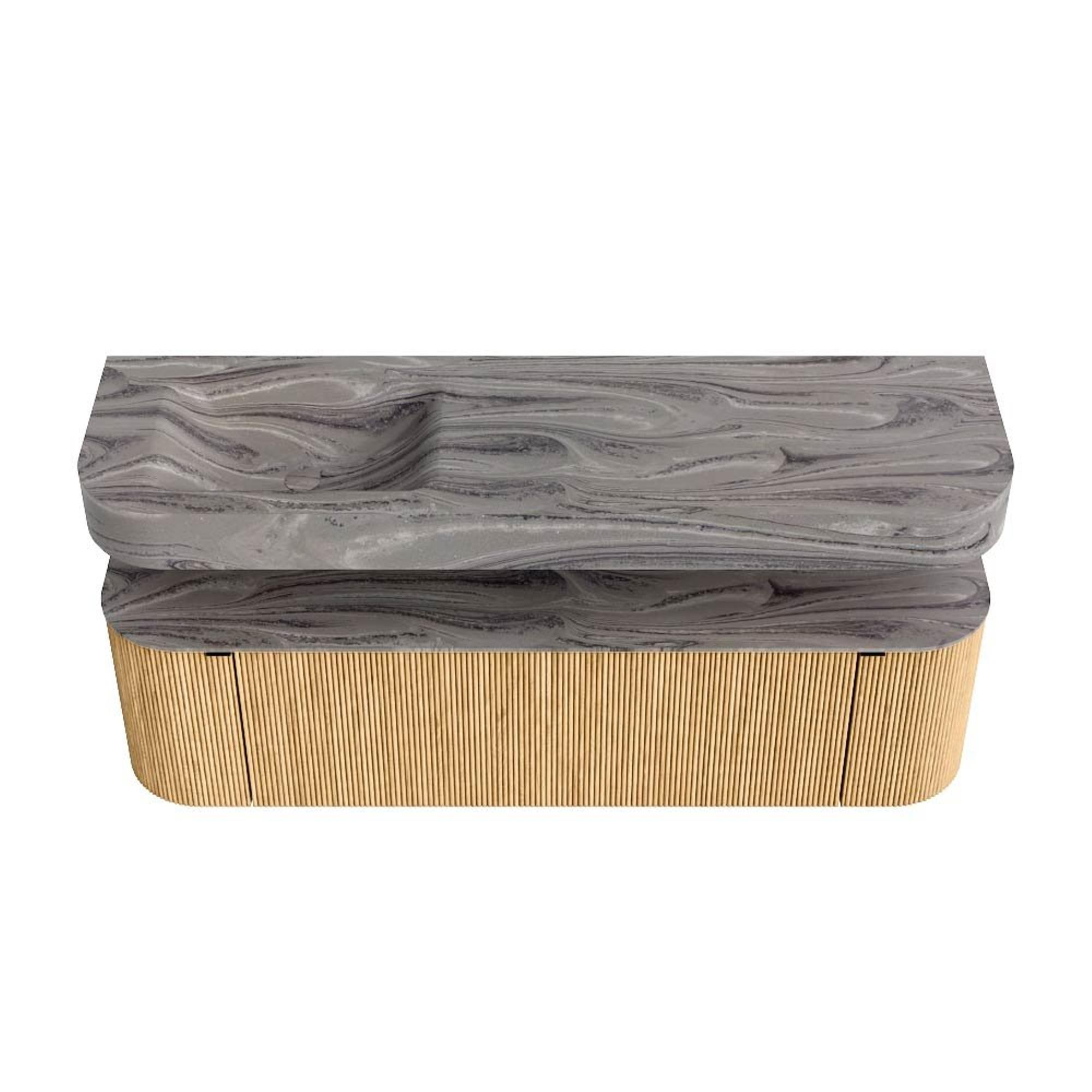 MONDIAZ THOR-DLUX 160cm badmeubel ronding links + rechts kleur Oak met 1 lade en 2 deuren. Vrijhangende wastafel CLOUD Links 1 kraangat kleur Sombra.