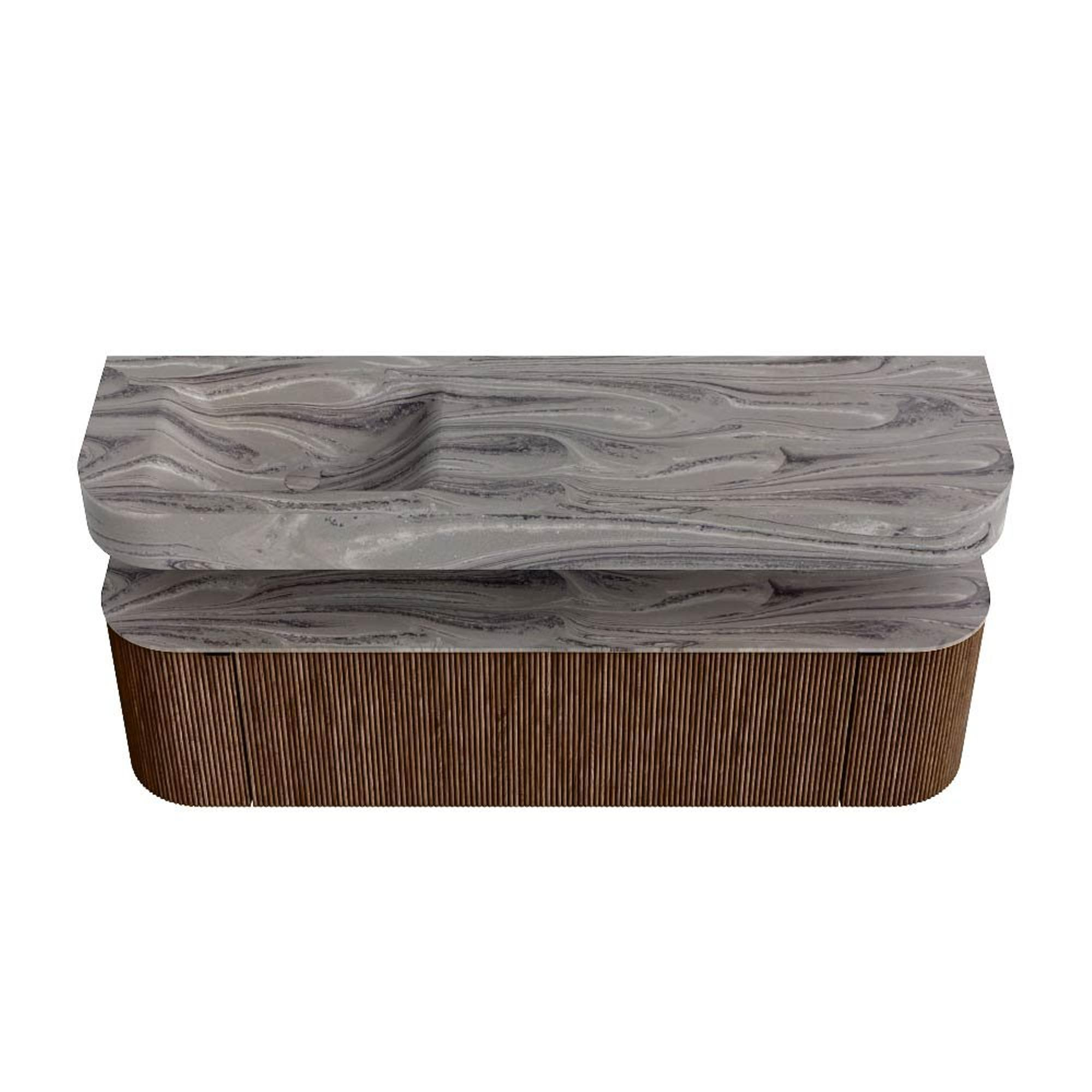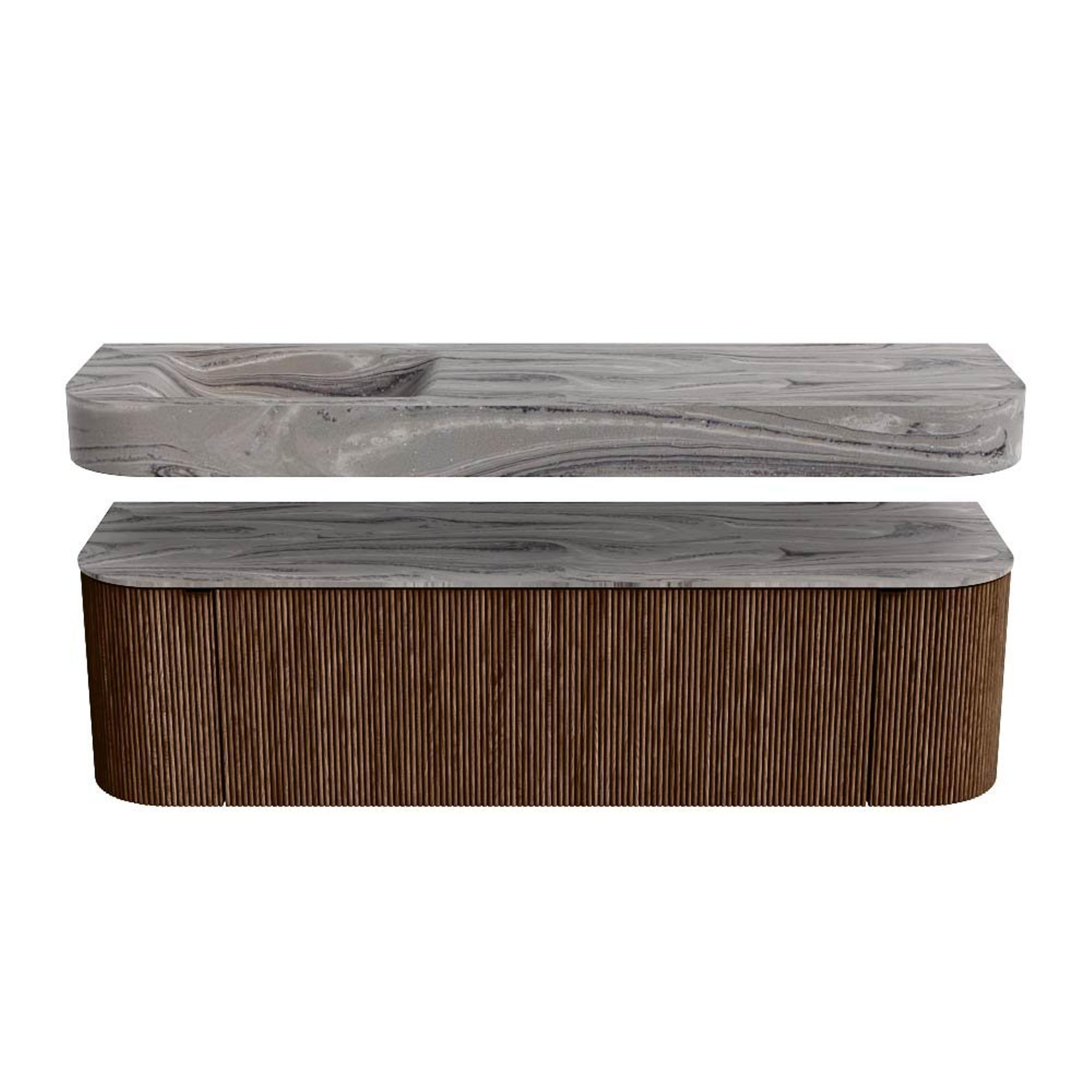 MONDIAZ THOR-DLUX 160cm badmeubel ronding links + rechts kleur Walnut met 1 lade en 2 deuren. Vrijhangende wastafel CLOUD Links zonder kraangat kleur Sombra.