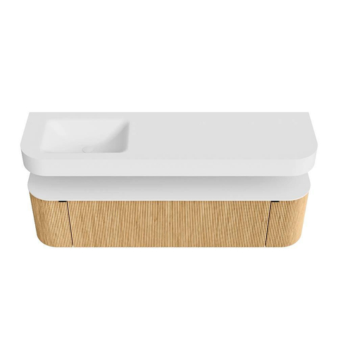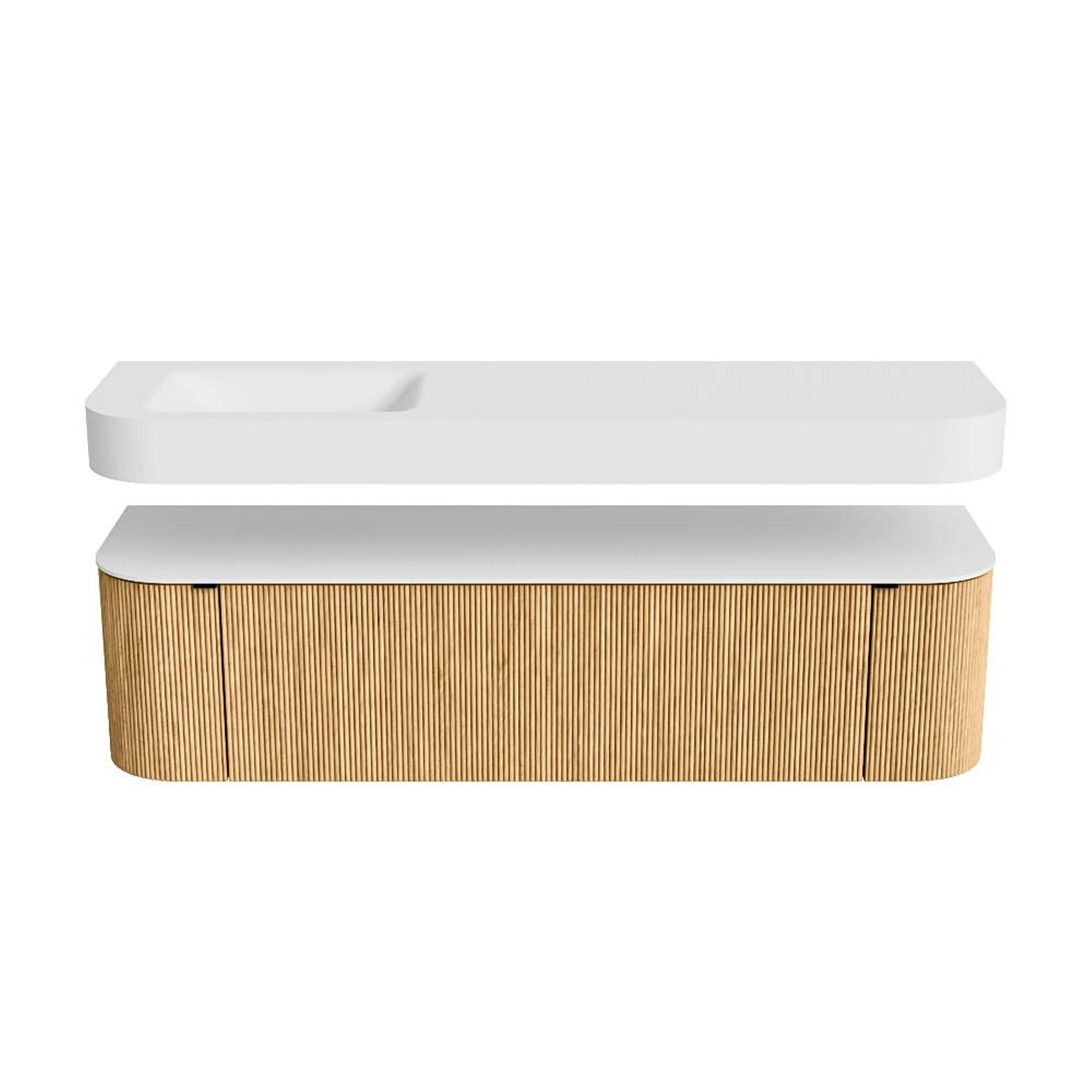 Boven het meubel zweeft een bijpassende, vrij hangende wastafel met afgeronde hoeken – perfect afgestemd op de vorm van de kast. De wastafel is uitgevoerd in Solid Surface en volgt subtiel de lijnen van het onderliggende meubel, waardoor een harmonieus geheel ontstaat. Het Solid Surface topblad vormt een sterke, onderhoudsvriendelijke basis en maakt de combinatie compleet.
