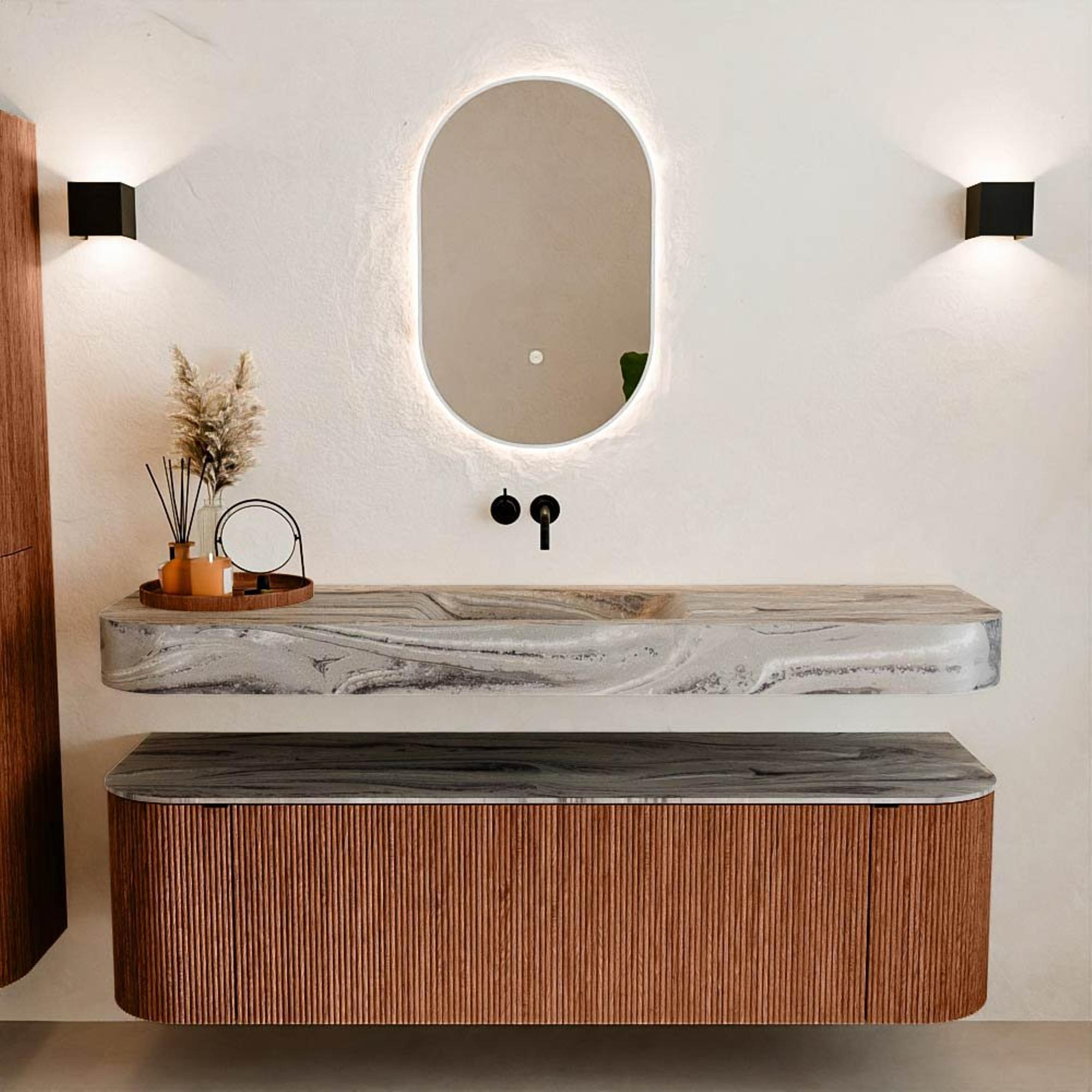 Natuurlijke materialen in warme tinten. De verticale ribbels brengen ritme en textuur in het ontwerp, terwijl het eikenhout zorgt voor een warme, ambachtelijke uitstraling. Kies uit 5 houttinten OAK, WALNUT, DUSK, SHADOW en RUBY zorgvuldig geselecteerde houtkleuren om zowel moderne als klassieke badkamers te verrijken.