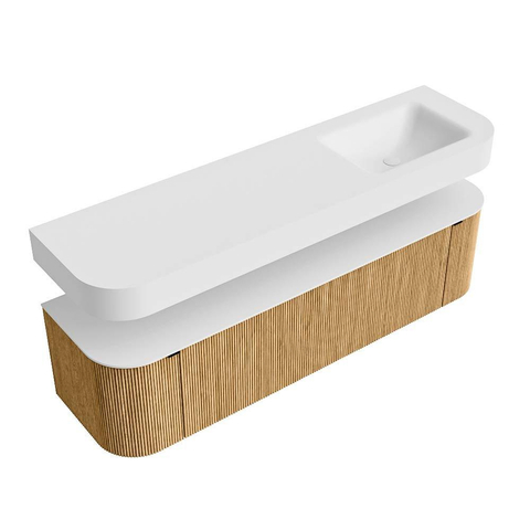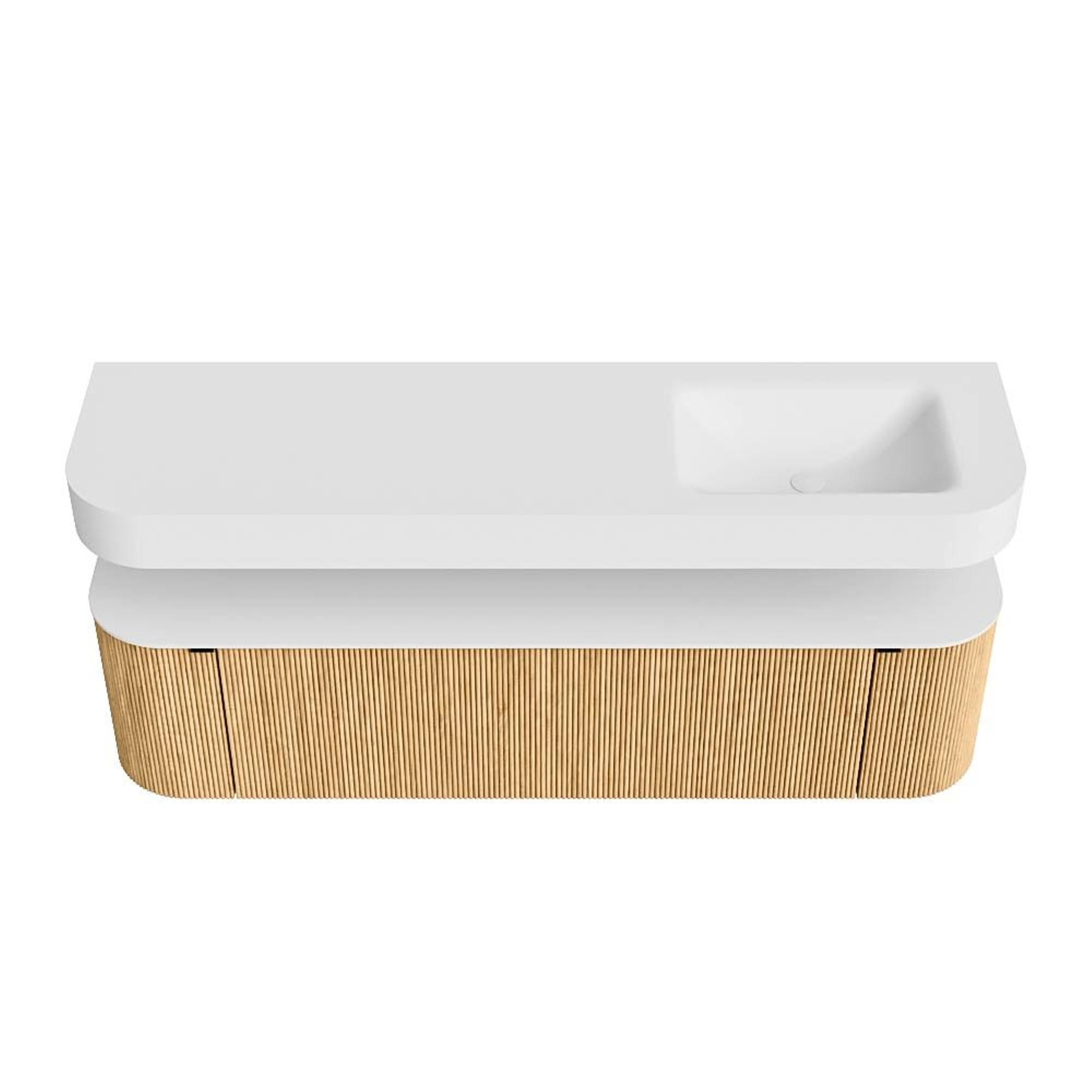 Boven het meubel zweeft een bijpassende, vrij hangende wastafel met afgeronde hoeken – perfect afgestemd op de vorm van de kast. De wastafel is uitgevoerd in Solid Surface en volgt subtiel de lijnen van het onderliggende meubel, waardoor een harmonieus geheel ontstaat. Het Solid Surface topblad vormt een sterke, onderhoudsvriendelijke basis en maakt de combinatie compleet.