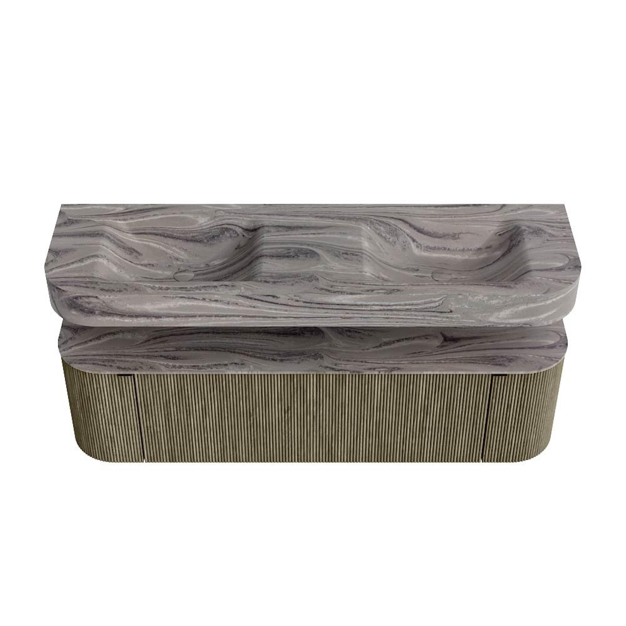 MONDIAZ THOR-DLUX 160cm badmeubel ronding links + rechts kleur Shadow met 1 lade en 2 deuren. Vrijhangende wastafel CLOUD Dubbel zonder kraangat kleur Sombra.