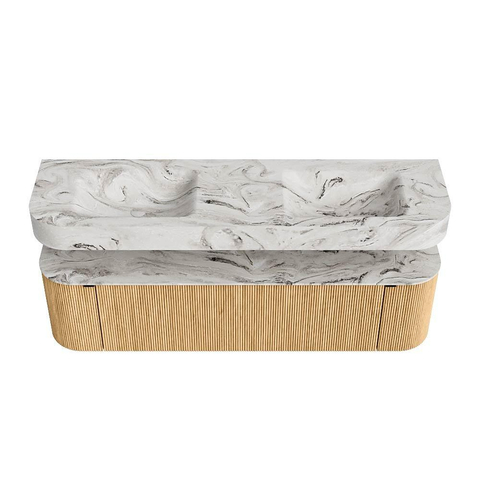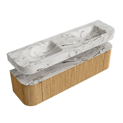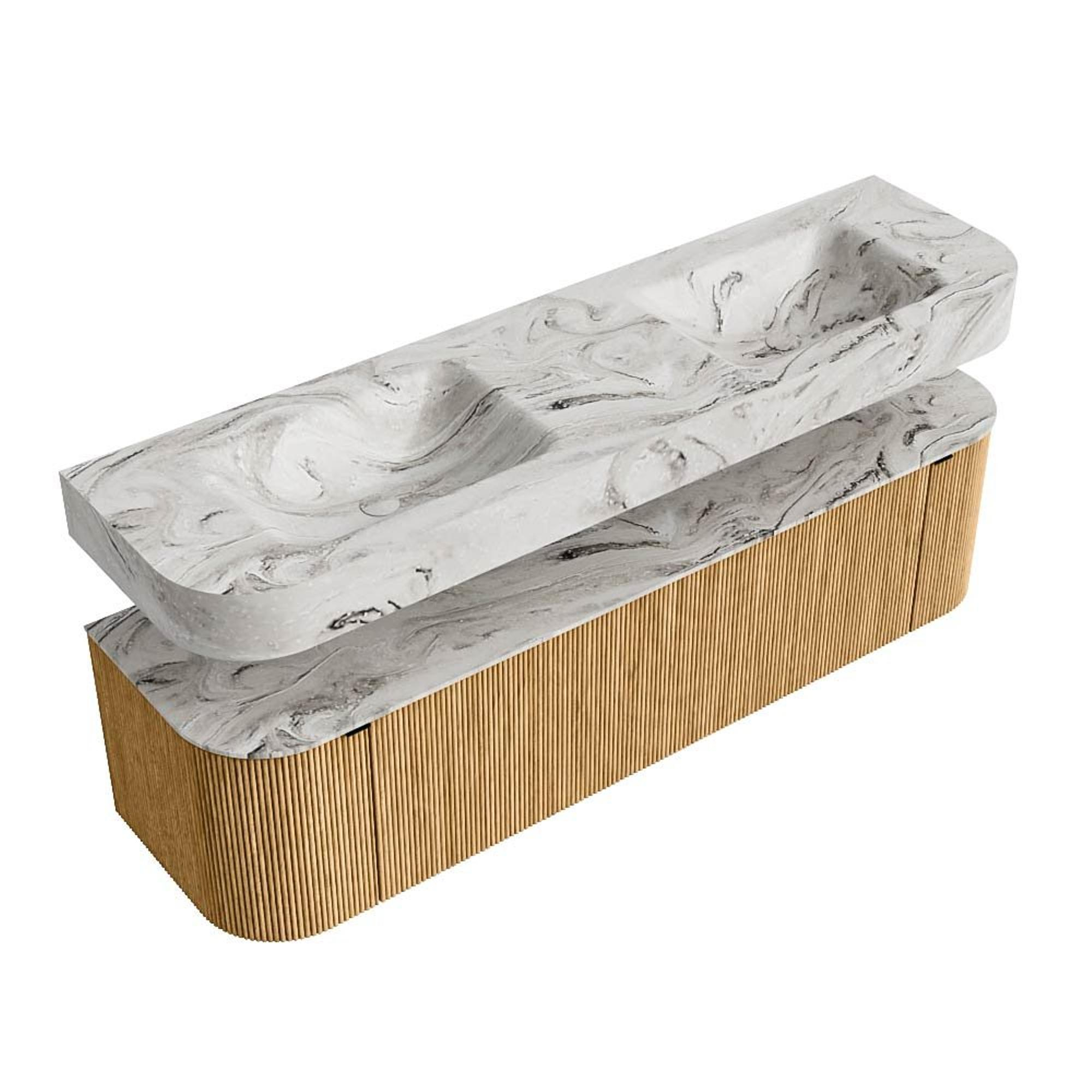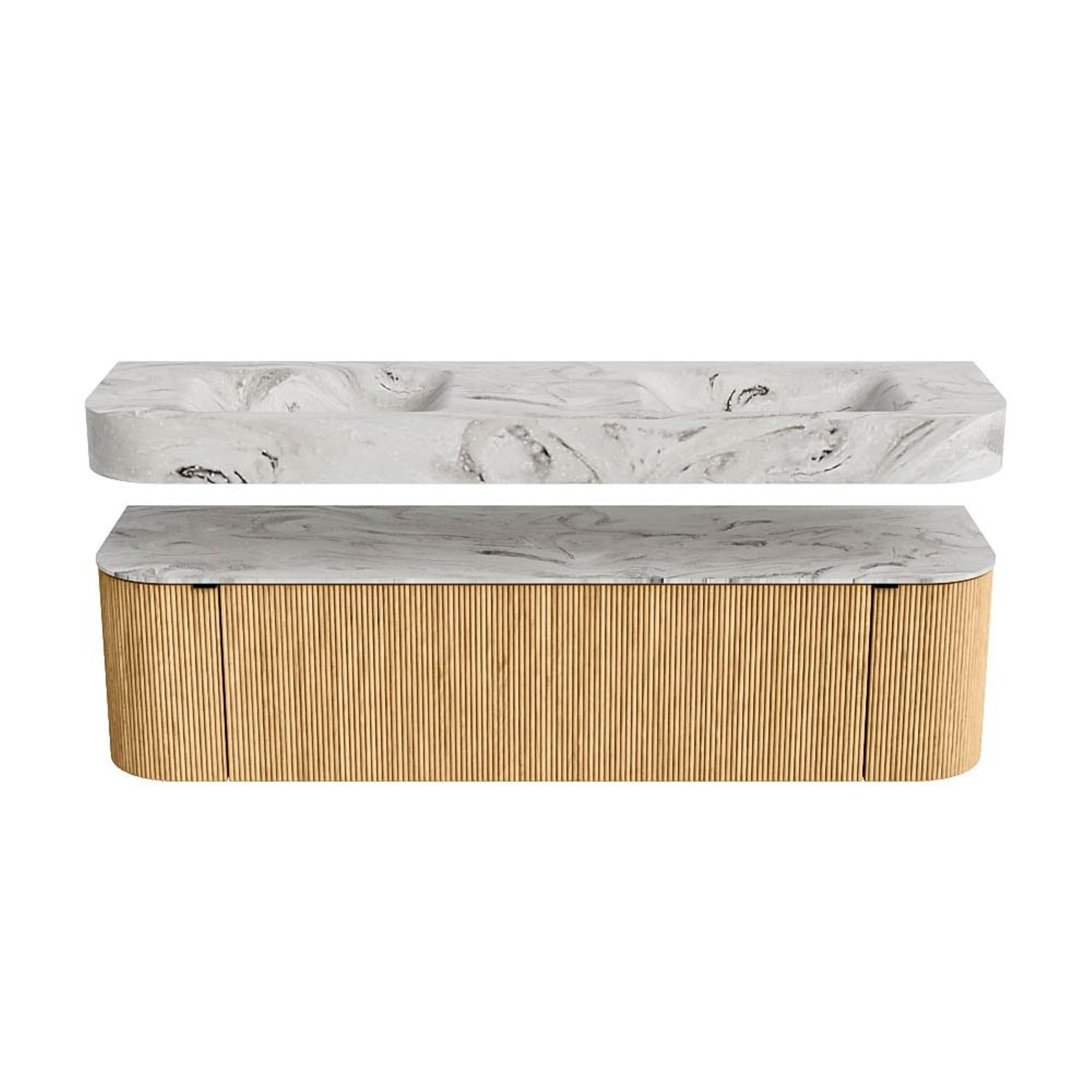 MONDIAZ THOR-DLUX 170cm badmeubel ronding links + rechts kleur Oak met 1 lade en 2 deuren. Vrijhangende wastafel CLOUD Dubbel 2 kraangaten kleur Glace.