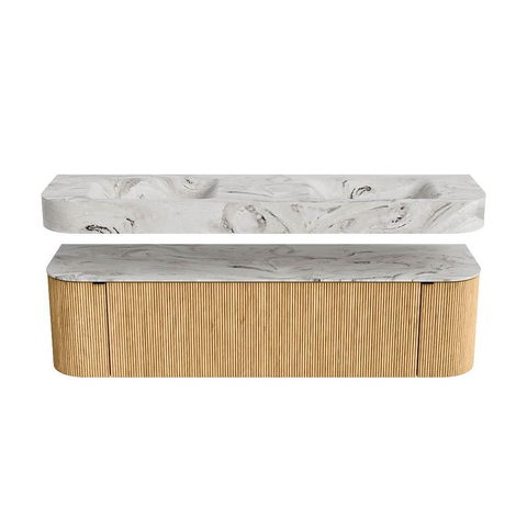 Boven het meubel zweeft een bijpassende, vrij hangende wastafel met afgeronde hoeken – perfect afgestemd op de vorm van de kast. De wastafel is uitgevoerd in Solid Surface en volgt subtiel de lijnen van het onderliggende meubel, waardoor een harmonieus geheel ontstaat. Het Solid Surface topblad vormt een sterke, onderhoudsvriendelijke basis en maakt de combinatie compleet.