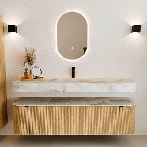 Boven het meubel zweeft een bijpassende, vrij hangende wastafel met afgeronde hoeken – perfect afgestemd op de vorm van de kast. De wastafel is uitgevoerd in Solid Surface en volgt subtiel de lijnen van het onderliggende meubel, waardoor een harmonieus geheel ontstaat. Het Solid Surface topblad vormt een sterke, onderhoudsvriendelijke basis en maakt de combinatie compleet.