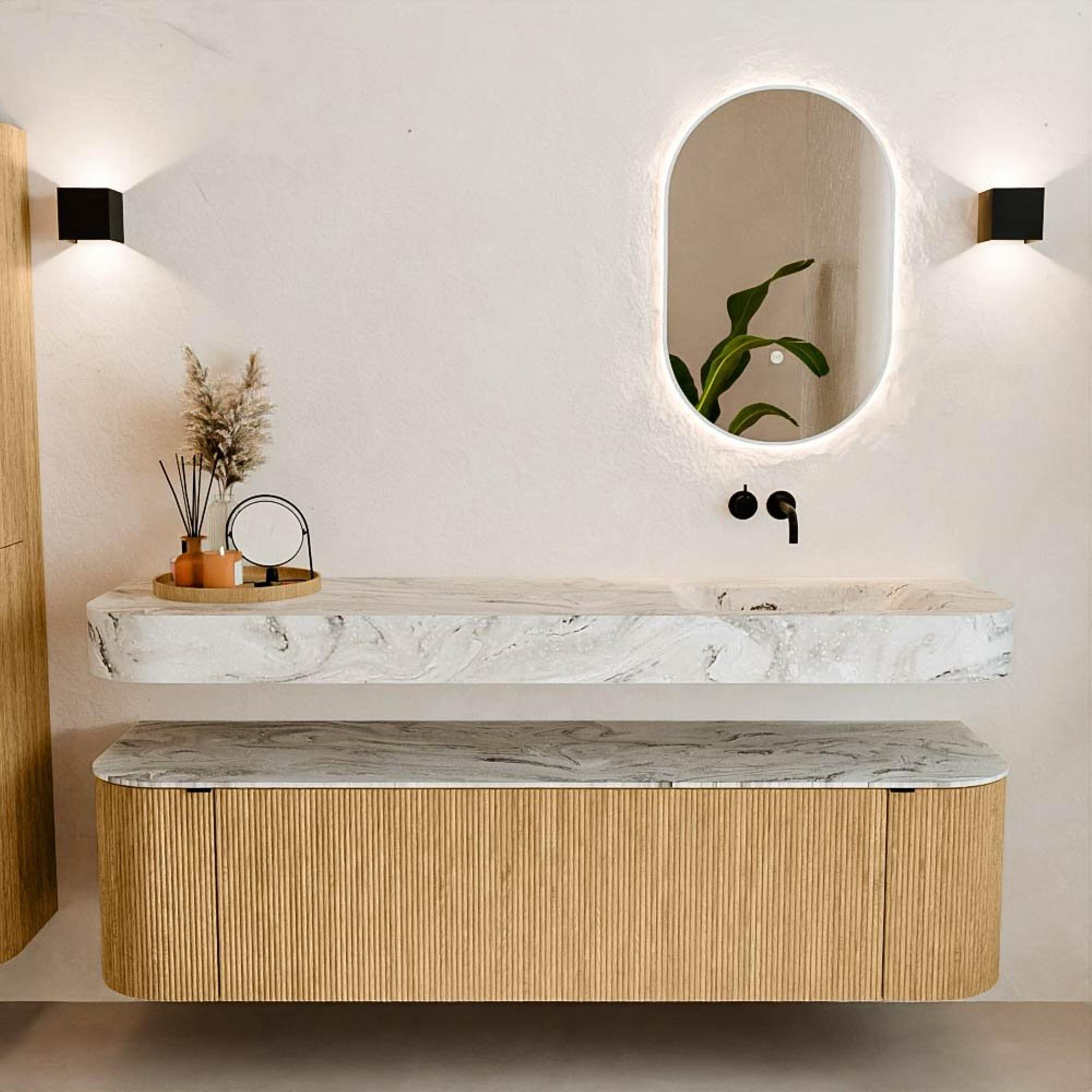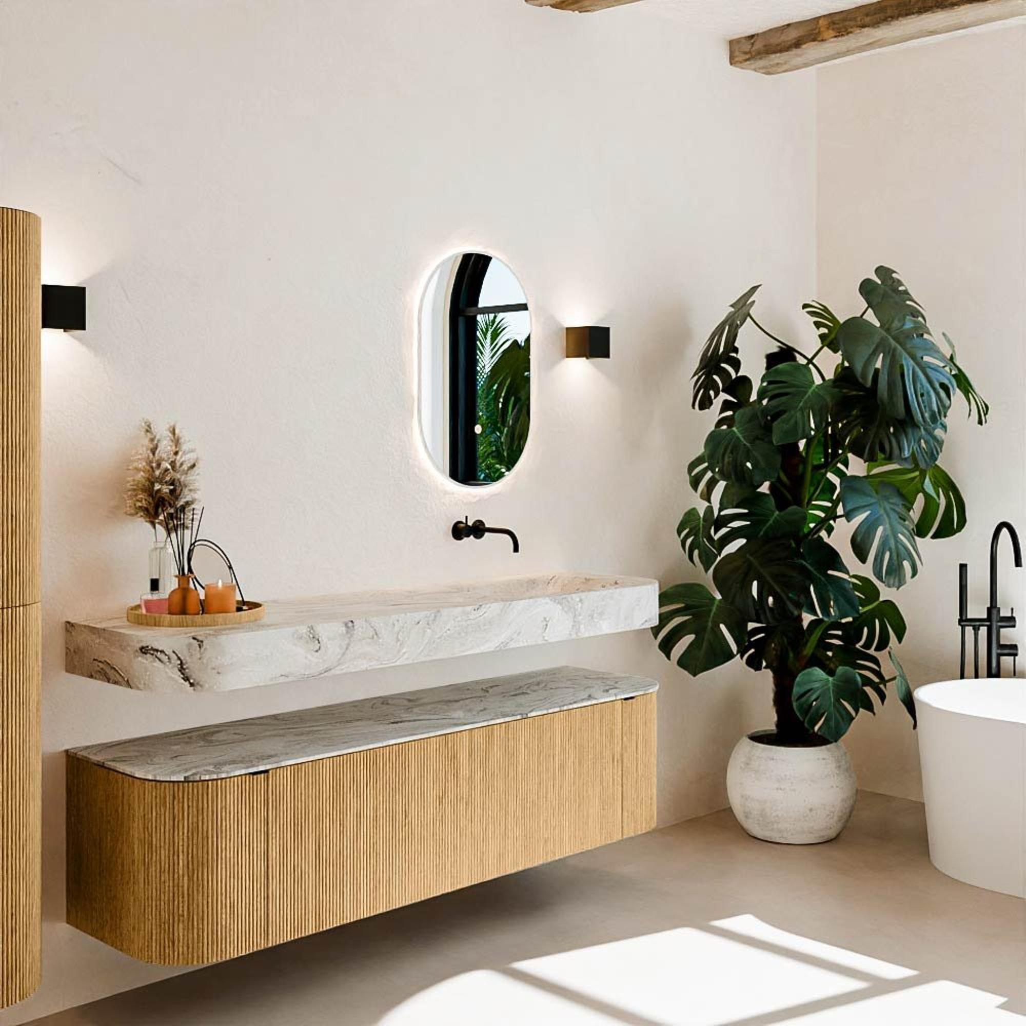 Natuurlijke materialen in warme tinten. De verticale ribbels brengen ritme en textuur in het ontwerp, terwijl het eikenhout zorgt voor een warme, ambachtelijke uitstraling. Kies uit 5 houttinten OAK, WALNUT, DUSK, SHADOW en RUBY zorgvuldig geselecteerde houtkleuren om zowel moderne als klassieke badkamers te verrijken.