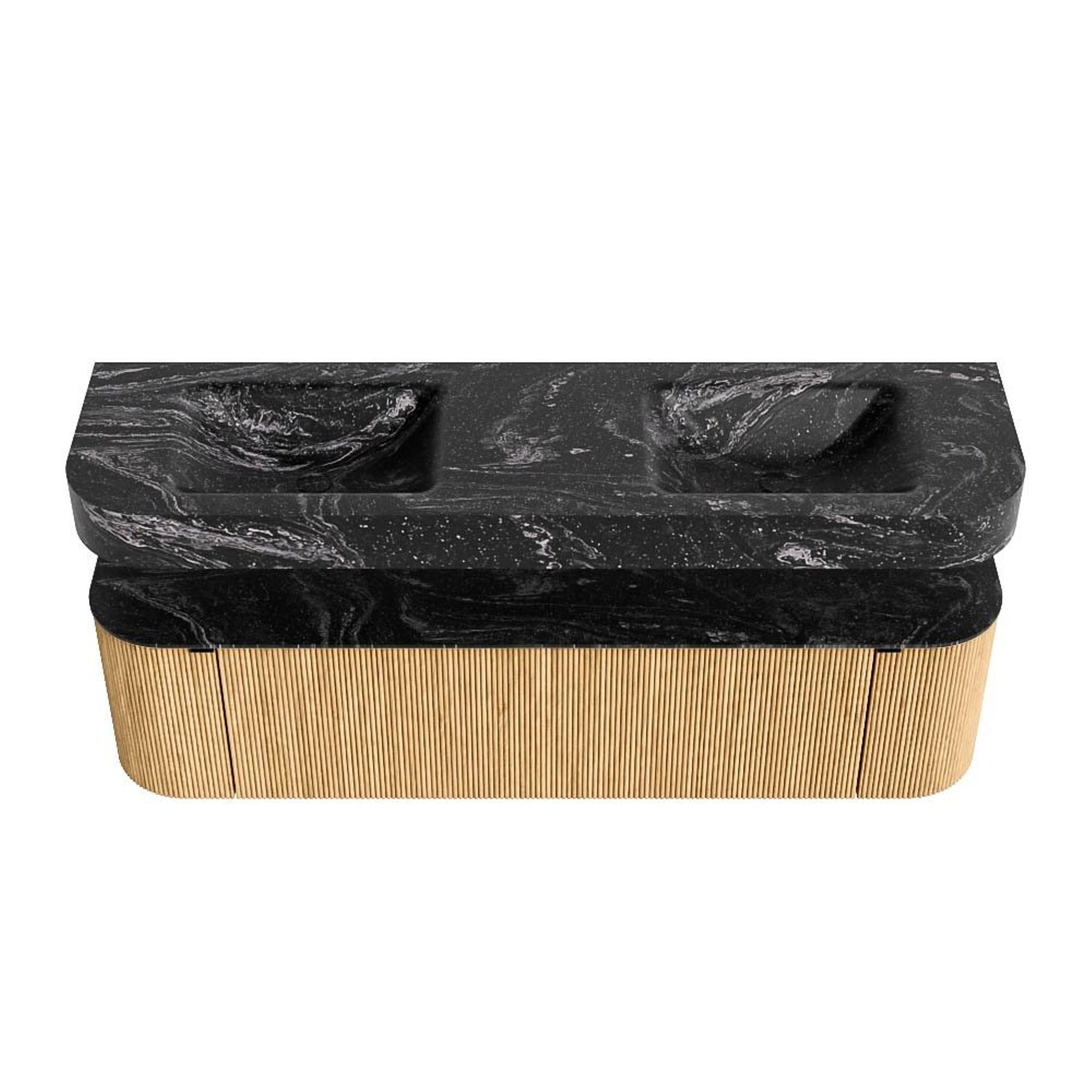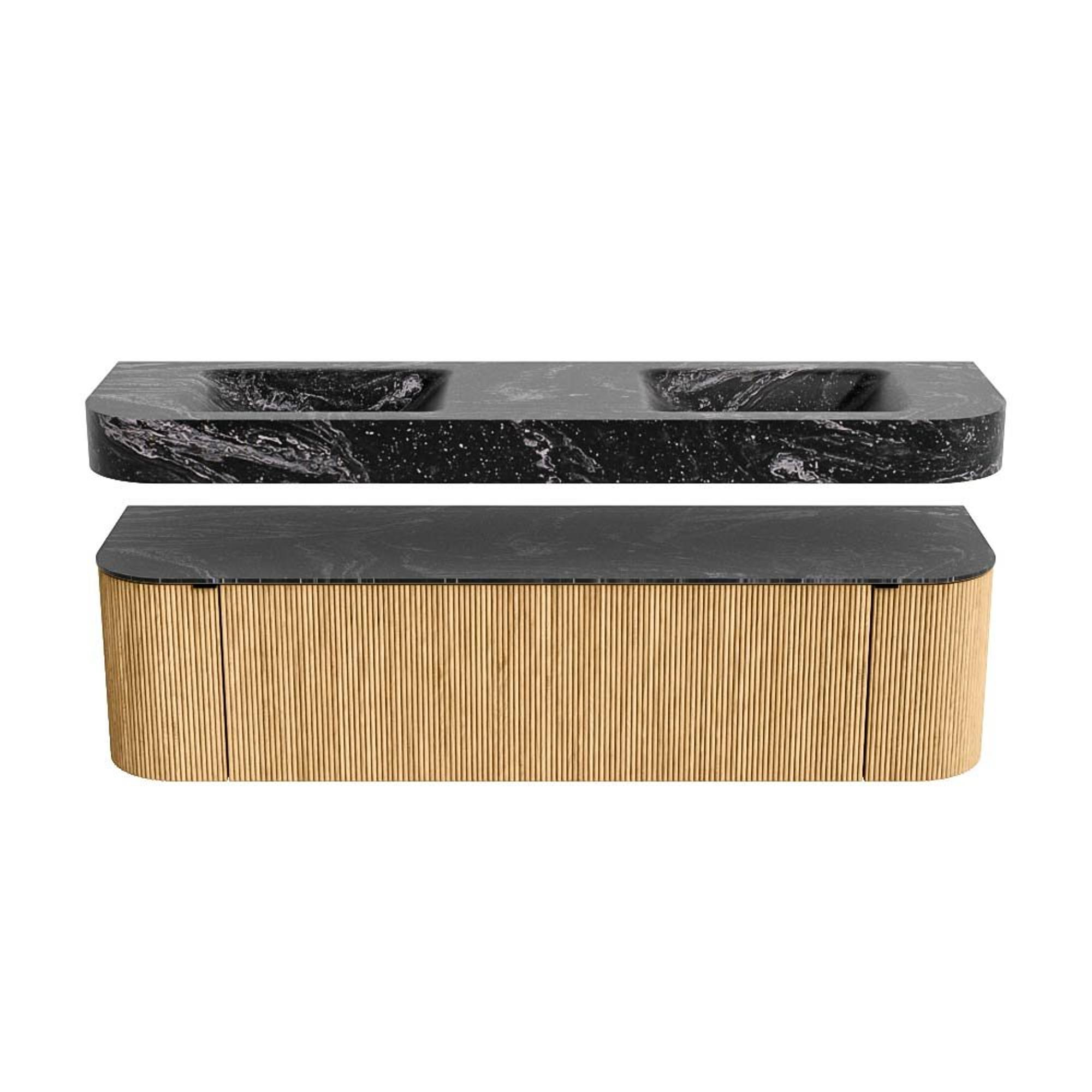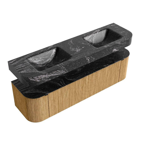 MONDIAZ THOR-DLUX 170cm badmeubel ronding links + rechts kleur Oak met 1 lade en 2 deuren. Vrijhangende wastafel CLOUD Dubbel 2 kraangaten kleur Lava.