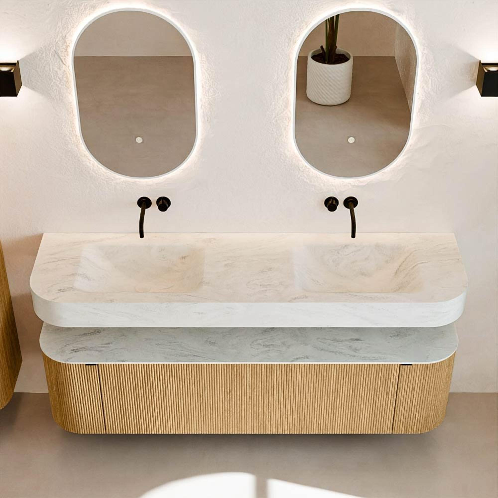 Natuurlijke materialen in warme tinten. De verticale ribbels brengen ritme en textuur in het ontwerp, terwijl het eikenhout zorgt voor een warme, ambachtelijke uitstraling. Kies uit 5 houttinten OAK, WALNUT, DUSK, SHADOW en RUBY zorgvuldig geselecteerde houtkleuren om zowel moderne als klassieke badkamers te verrijken.