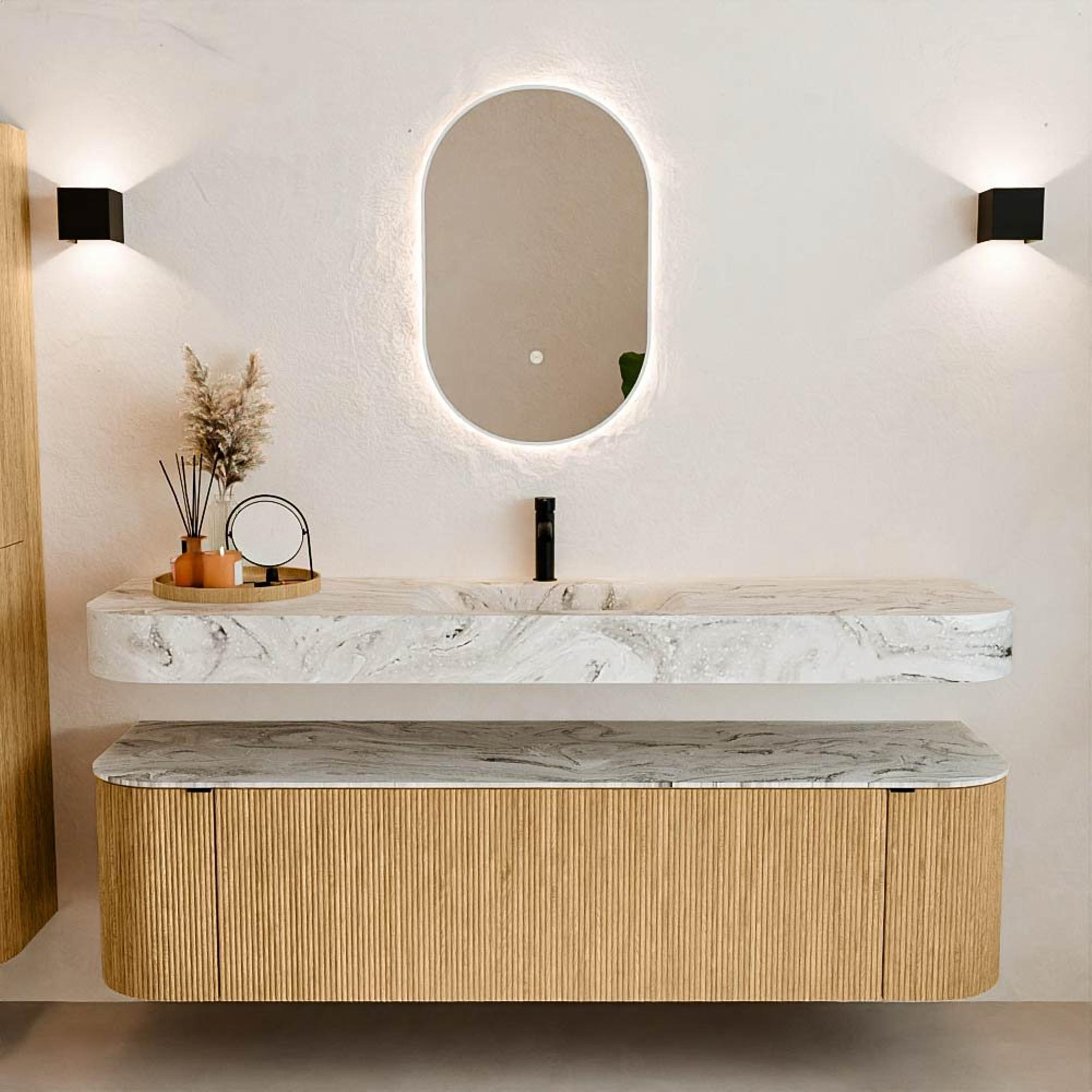 Natuurlijke materialen in warme tinten. De verticale ribbels brengen ritme en textuur in het ontwerp, terwijl het eikenhout zorgt voor een warme, ambachtelijke uitstraling. Kies uit 5 houttinten OAK, WALNUT, DUSK, SHADOW en RUBY zorgvuldig geselecteerde houtkleuren om zowel moderne als klassieke badkamers te verrijken.