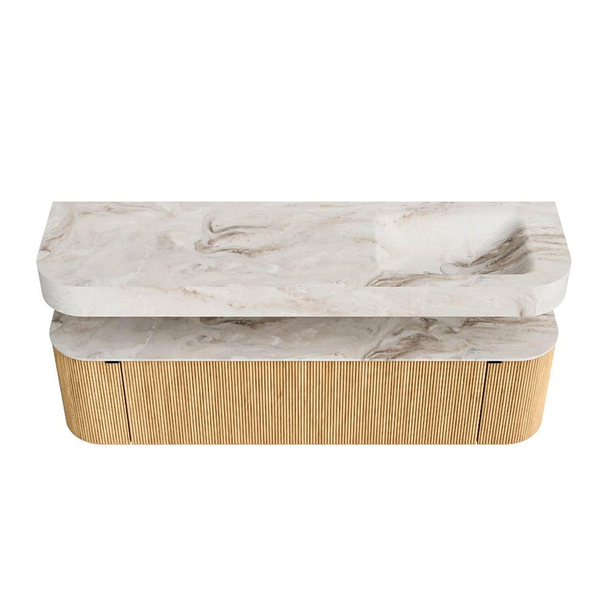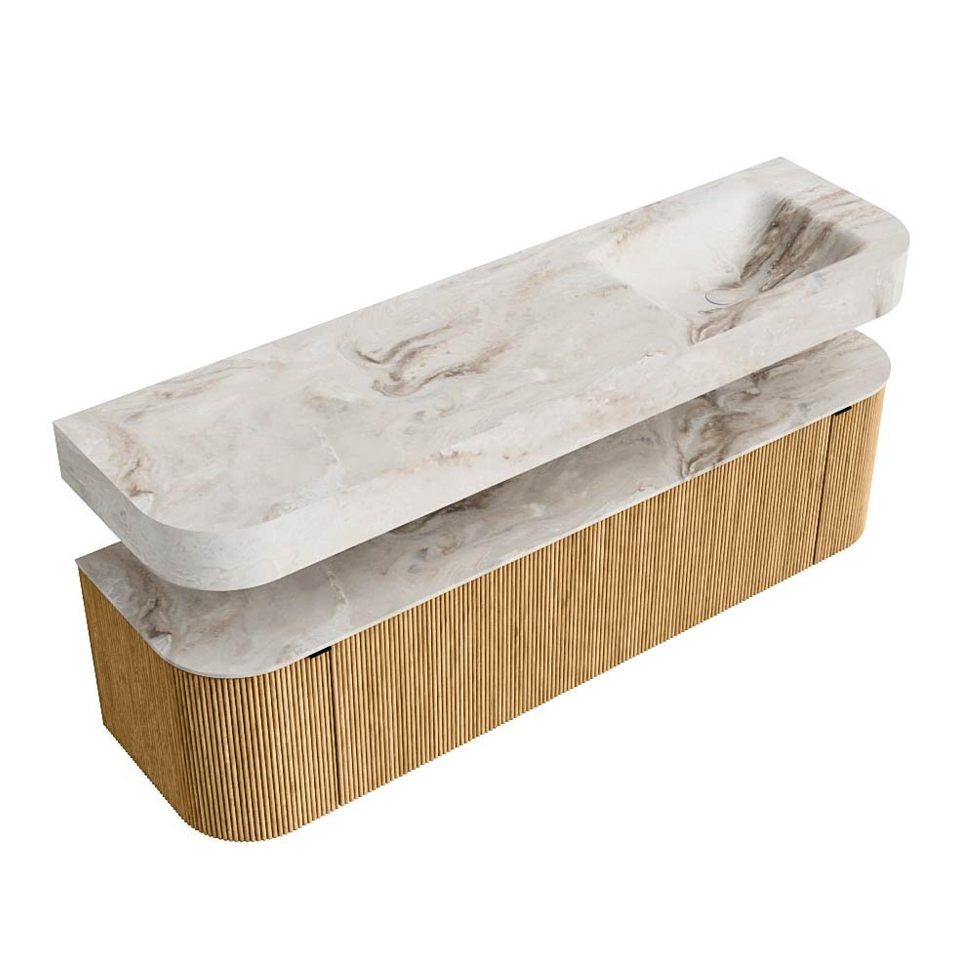 MONDIAZ THOR-DLUX 170cm badmeubel ronding links + rechts kleur Oak met 1 lade en 2 deuren. Vrijhangende wastafel CLOUD Rechts 1 kraangat kleur Frappe.