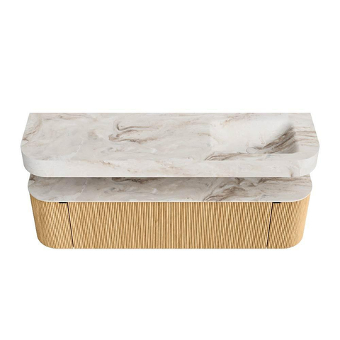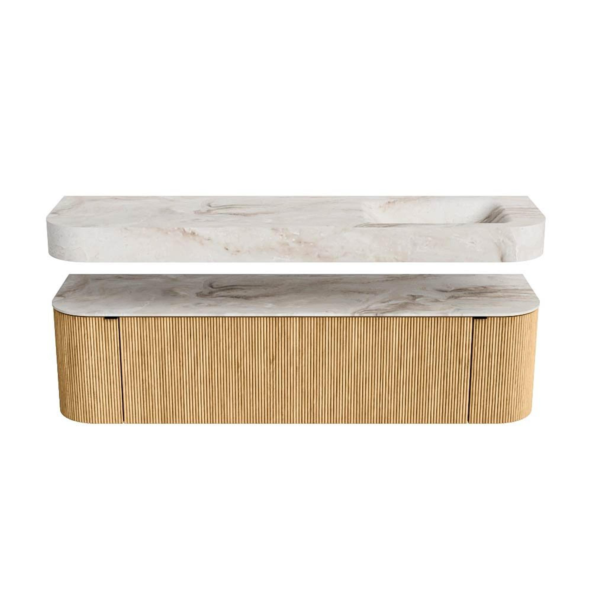 Boven het meubel zweeft een bijpassende, vrij hangende wastafel met afgeronde hoeken – perfect afgestemd op de vorm van de kast. De wastafel is uitgevoerd in Solid Surface en volgt subtiel de lijnen van het onderliggende meubel, waardoor een harmonieus geheel ontstaat. Het Solid Surface topblad vormt een sterke, onderhoudsvriendelijke basis en maakt de combinatie compleet.