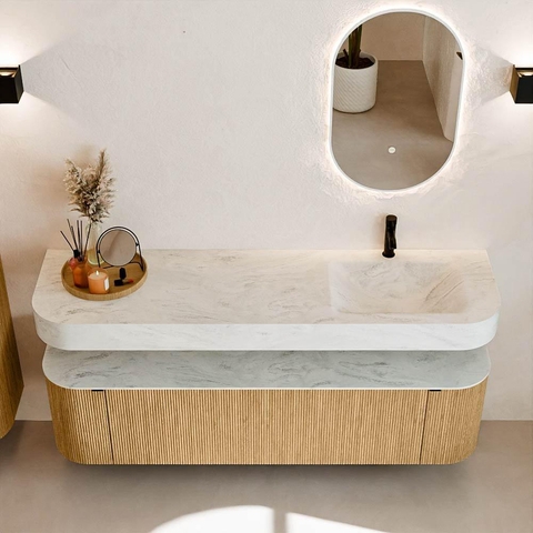 Boven het meubel zweeft een bijpassende, vrij hangende wastafel met afgeronde hoeken – perfect afgestemd op de vorm van de kast. De wastafel is uitgevoerd in Solid Surface en volgt subtiel de lijnen van het onderliggende meubel, waardoor een harmonieus geheel ontstaat. Het Solid Surface topblad vormt een sterke, onderhoudsvriendelijke basis en maakt de combinatie compleet.