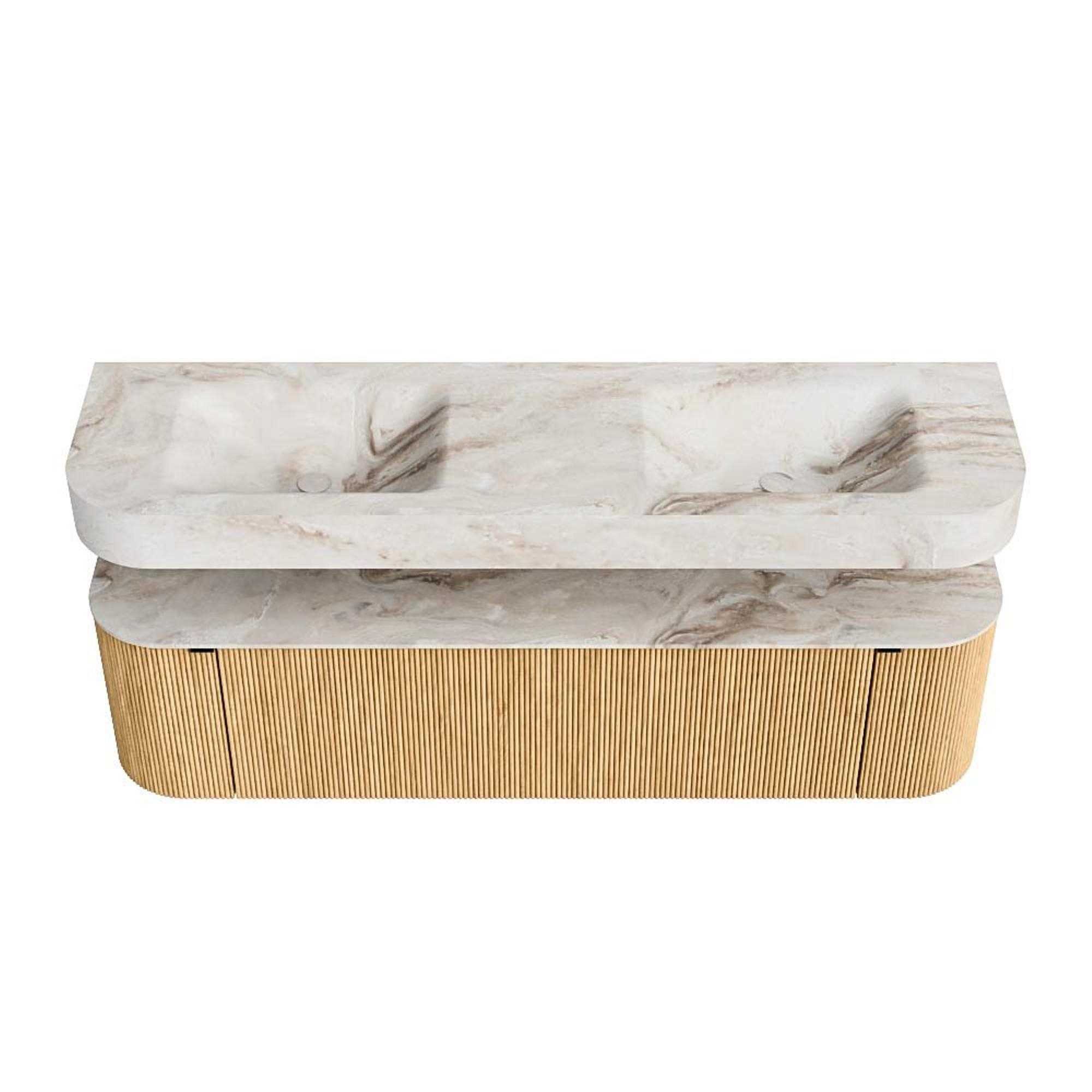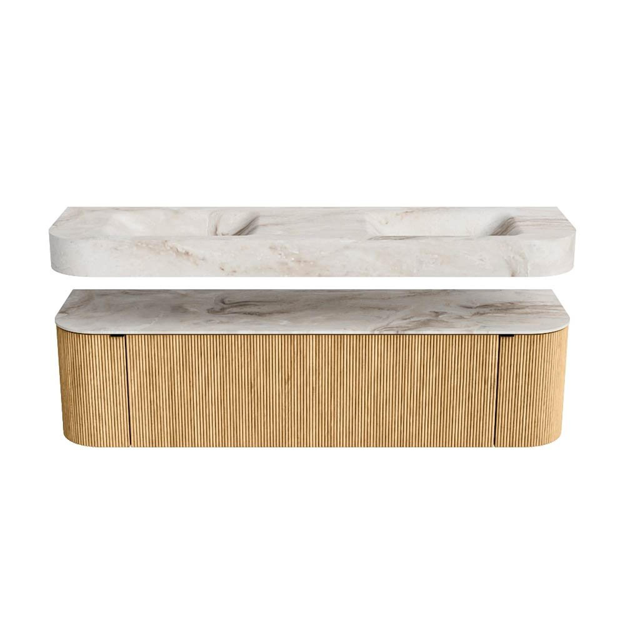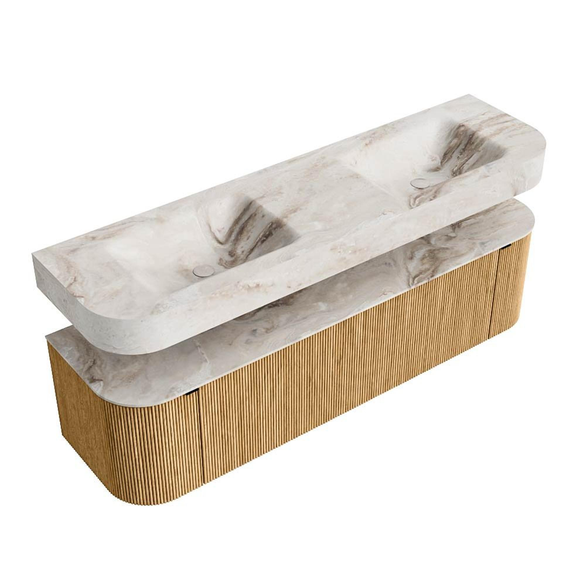 MONDIAZ THOR-DLUX 170cm badmeubel ronding links + rechts kleur Oak met 1 lade en 2 deuren. Vrijhangende wastafel CLOUD Dubbel zonder kraangat kleur Frappe.
