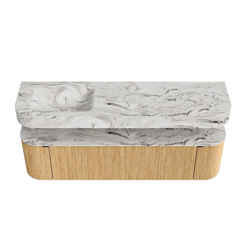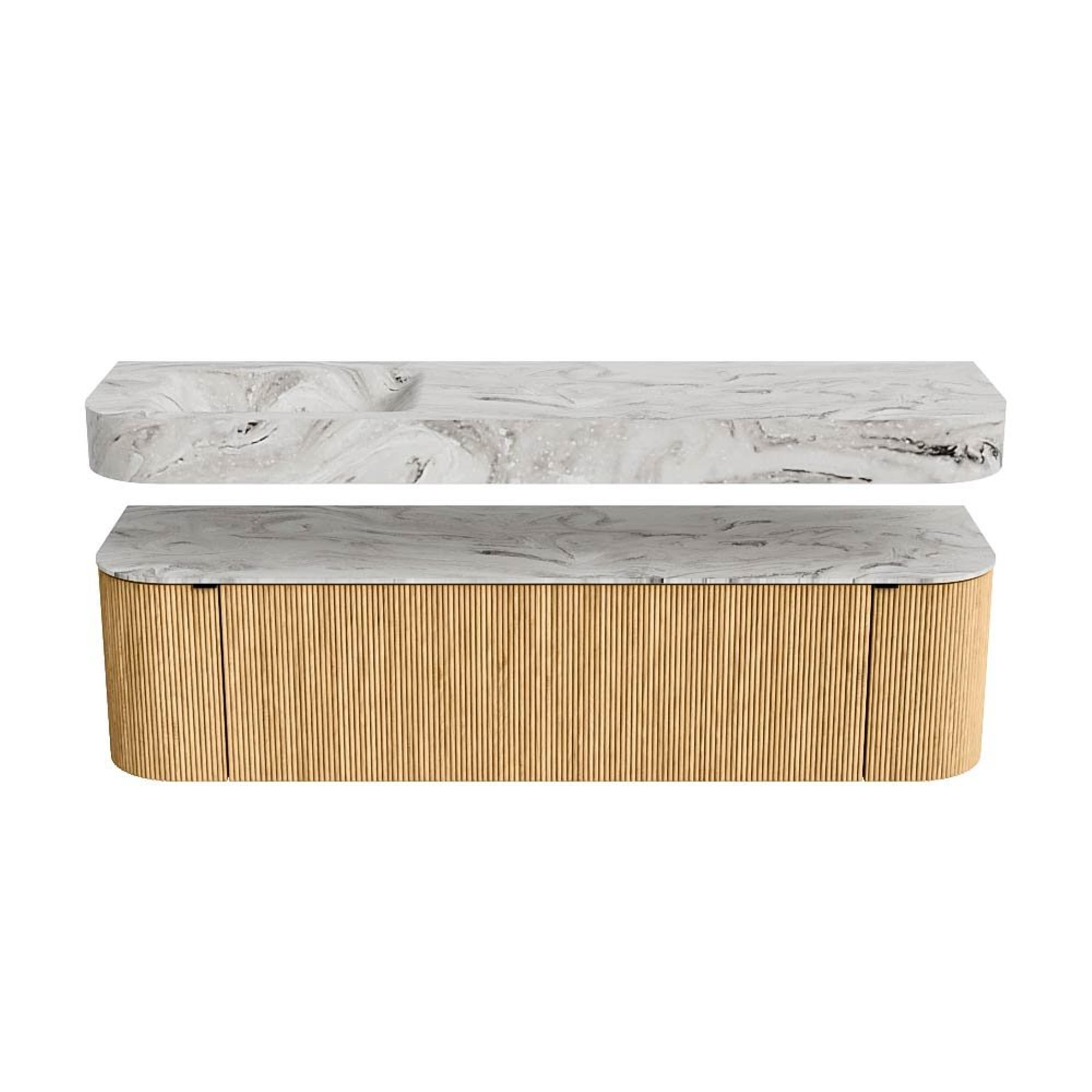 MONDIAZ THOR-DLUX 170cm badmeubel ronding links + rechts kleur Oak met 1 lade en 2 deuren. Vrijhangende wastafel CLOUD Links zonder kraangat kleur Glace.