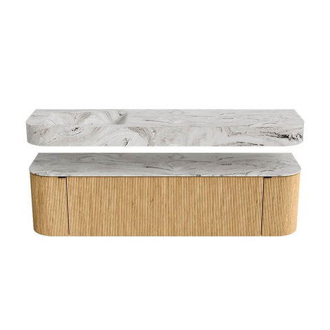 Boven het meubel zweeft een bijpassende, vrij hangende wastafel met afgeronde hoeken – perfect afgestemd op de vorm van de kast. De wastafel is uitgevoerd in Solid Surface en volgt subtiel de lijnen van het onderliggende meubel, waardoor een harmonieus geheel ontstaat. Het Solid Surface topblad vormt een sterke, onderhoudsvriendelijke basis en maakt de combinatie compleet.