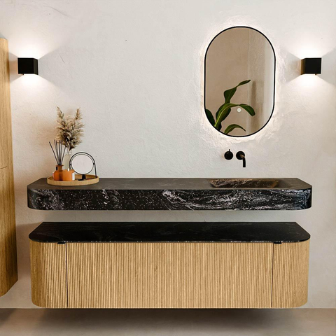 Natuurlijke materialen in warme tinten. De verticale ribbels brengen ritme en textuur in het ontwerp, terwijl het eikenhout zorgt voor een warme, ambachtelijke uitstraling. Kies uit 5 houttinten OAK, WALNUT, DUSK, SHADOW en RUBY zorgvuldig geselecteerde houtkleuren om zowel moderne als klassieke badkamers te verrijken.