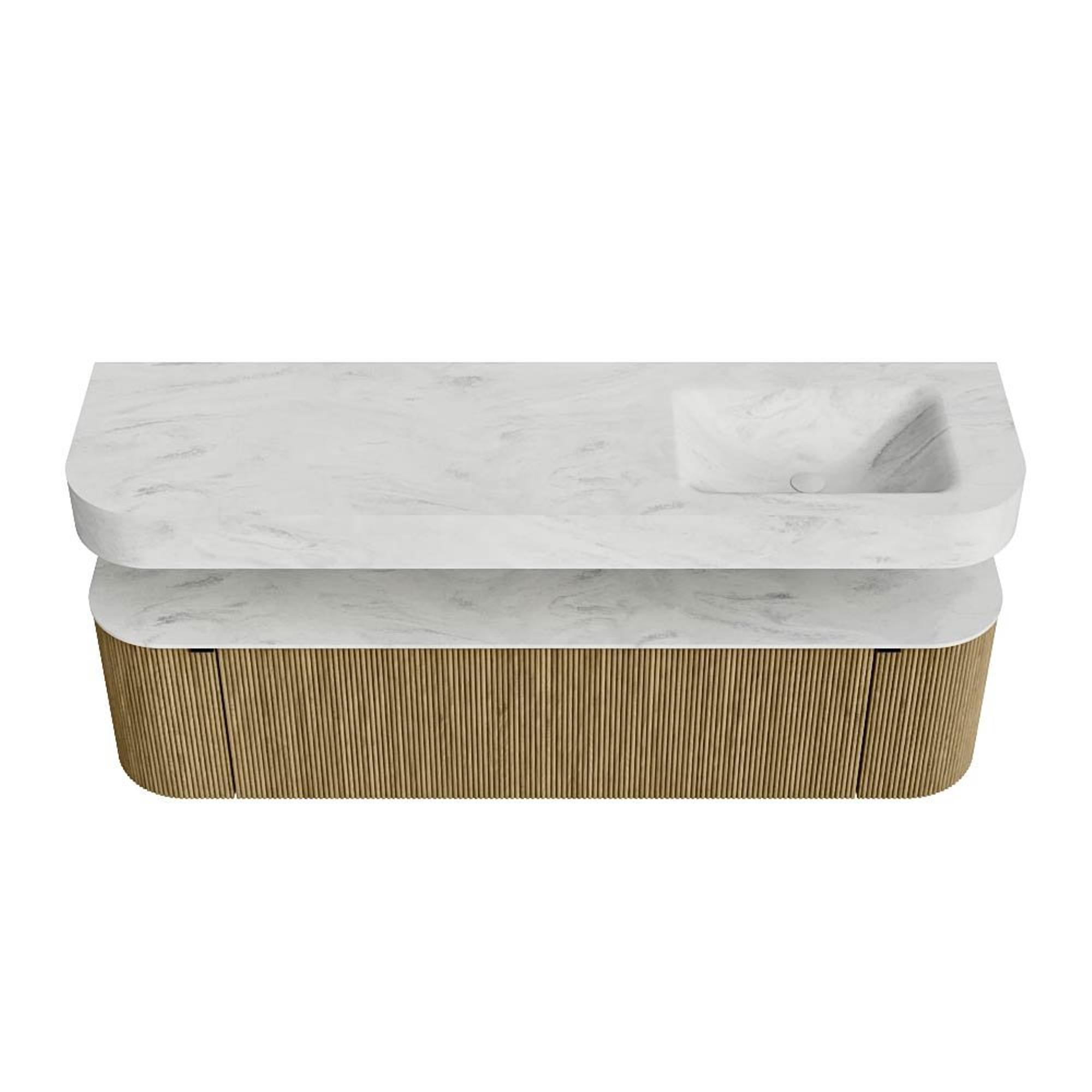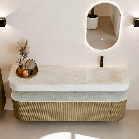 Boven het meubel zweeft een bijpassende, vrij hangende wastafel met afgeronde hoeken – perfect afgestemd op de vorm van de kast. De wastafel is uitgevoerd in Solid Surface en volgt subtiel de lijnen van het onderliggende meubel, waardoor een harmonieus geheel ontstaat. Het Solid Surface topblad vormt een sterke, onderhoudsvriendelijke basis en maakt de combinatie compleet.