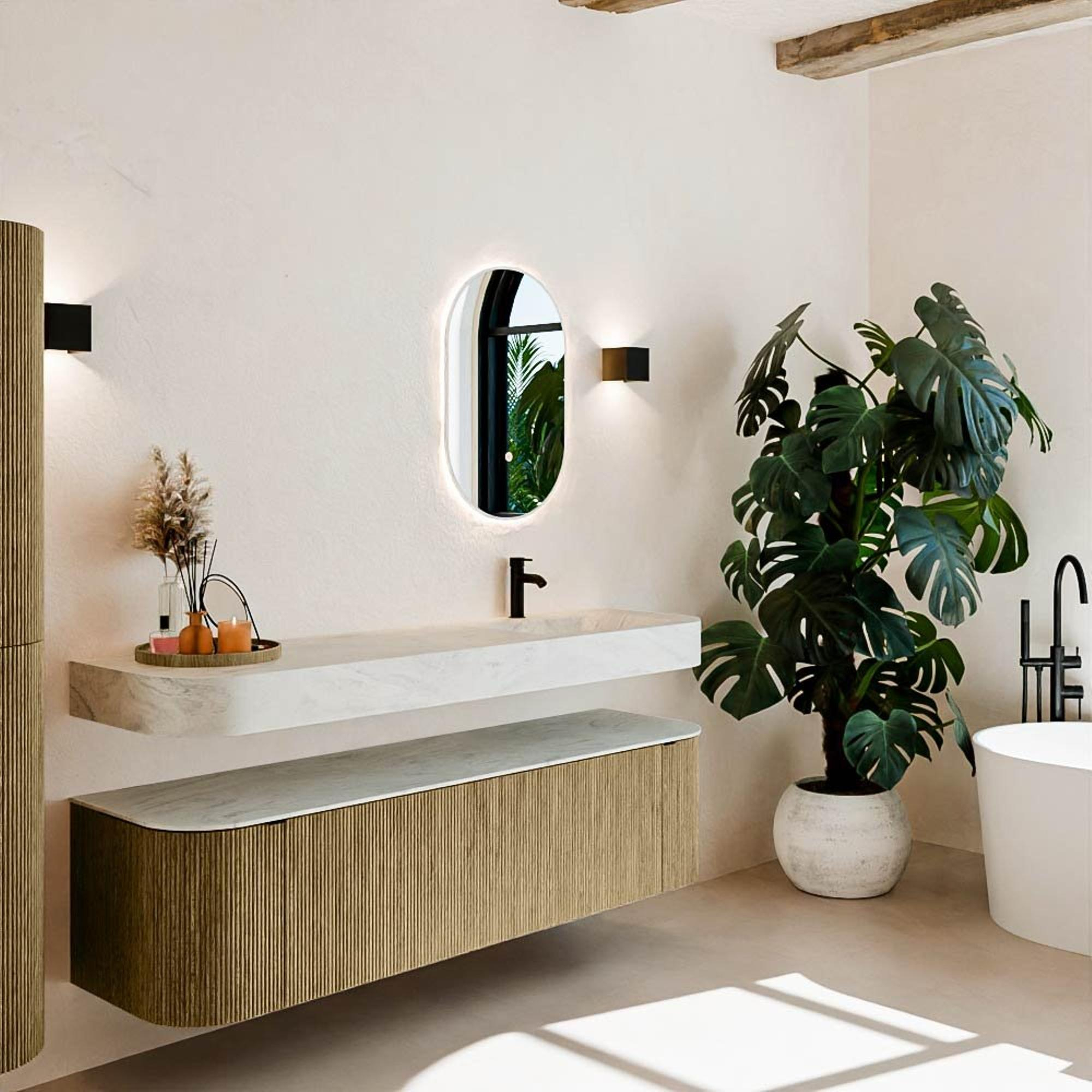 Natuurlijke materialen in warme tinten. De verticale ribbels brengen ritme en textuur in het ontwerp, terwijl het eikenhout zorgt voor een warme, ambachtelijke uitstraling. Kies uit 5 houttinten OAK, WALNUT, DUSK, SHADOW en RUBY zorgvuldig geselecteerde houtkleuren om zowel moderne als klassieke badkamers te verrijken.