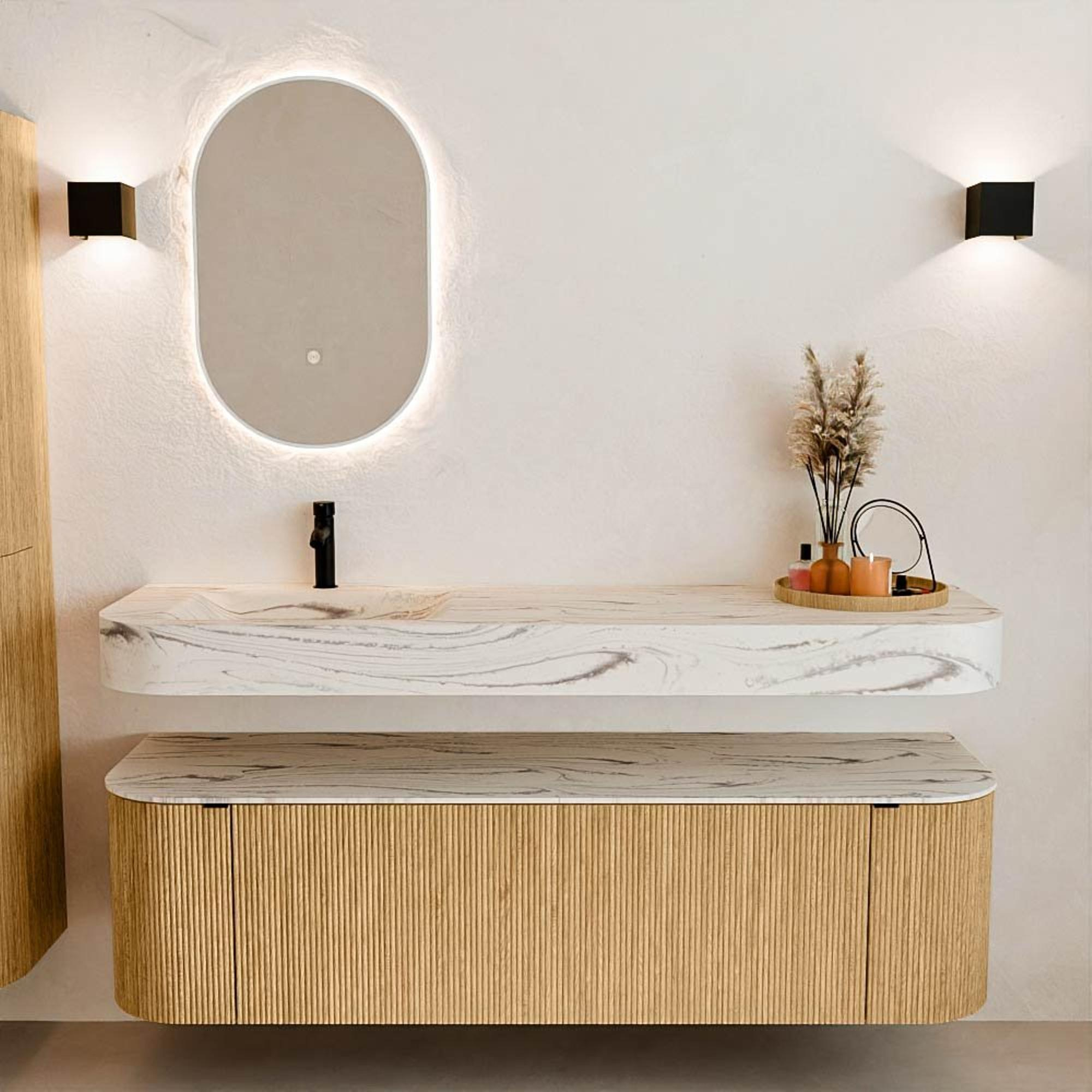 Natuurlijke materialen in warme tinten. De verticale ribbels brengen ritme en textuur in het ontwerp, terwijl het eikenhout zorgt voor een warme, ambachtelijke uitstraling. Kies uit 5 houttinten OAK, WALNUT, DUSK, SHADOW en RUBY zorgvuldig geselecteerde houtkleuren om zowel moderne als klassieke badkamers te verrijken.