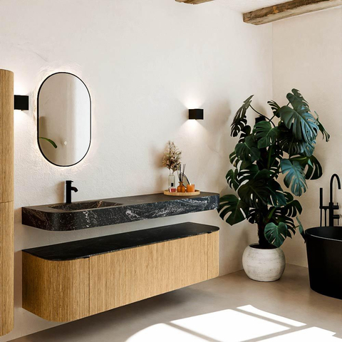 Natuurlijke materialen in warme tinten. De verticale ribbels brengen ritme en textuur in het ontwerp, terwijl het eikenhout zorgt voor een warme, ambachtelijke uitstraling. Kies uit 5 houttinten OAK, WALNUT, DUSK, SHADOW en RUBY zorgvuldig geselecteerde houtkleuren om zowel moderne als klassieke badkamers te verrijken.