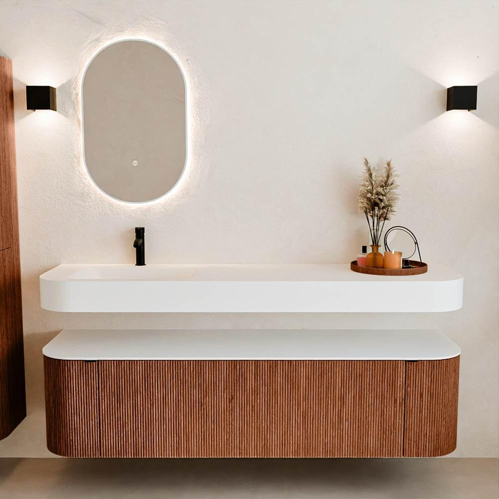 Natuurlijke materialen in warme tinten. De verticale ribbels brengen ritme en textuur in het ontwerp, terwijl het eikenhout zorgt voor een warme, ambachtelijke uitstraling. Kies uit 5 houttinten OAK, WALNUT, DUSK, SHADOW en RUBY zorgvuldig geselecteerde houtkleuren om zowel moderne als klassieke badkamers te verrijken.
