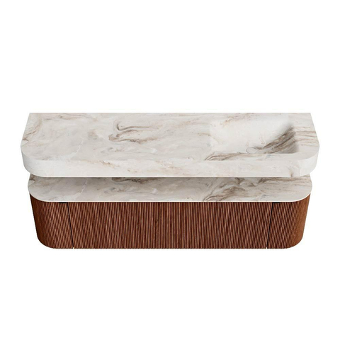 Boven het meubel zweeft een bijpassende, vrij hangende wastafel met afgeronde hoeken – perfect afgestemd op de vorm van de kast. De wastafel is uitgevoerd in Solid Surface en volgt subtiel de lijnen van het onderliggende meubel, waardoor een harmonieus geheel ontstaat. Het Solid Surface topblad vormt een sterke, onderhoudsvriendelijke basis en maakt de combinatie compleet.