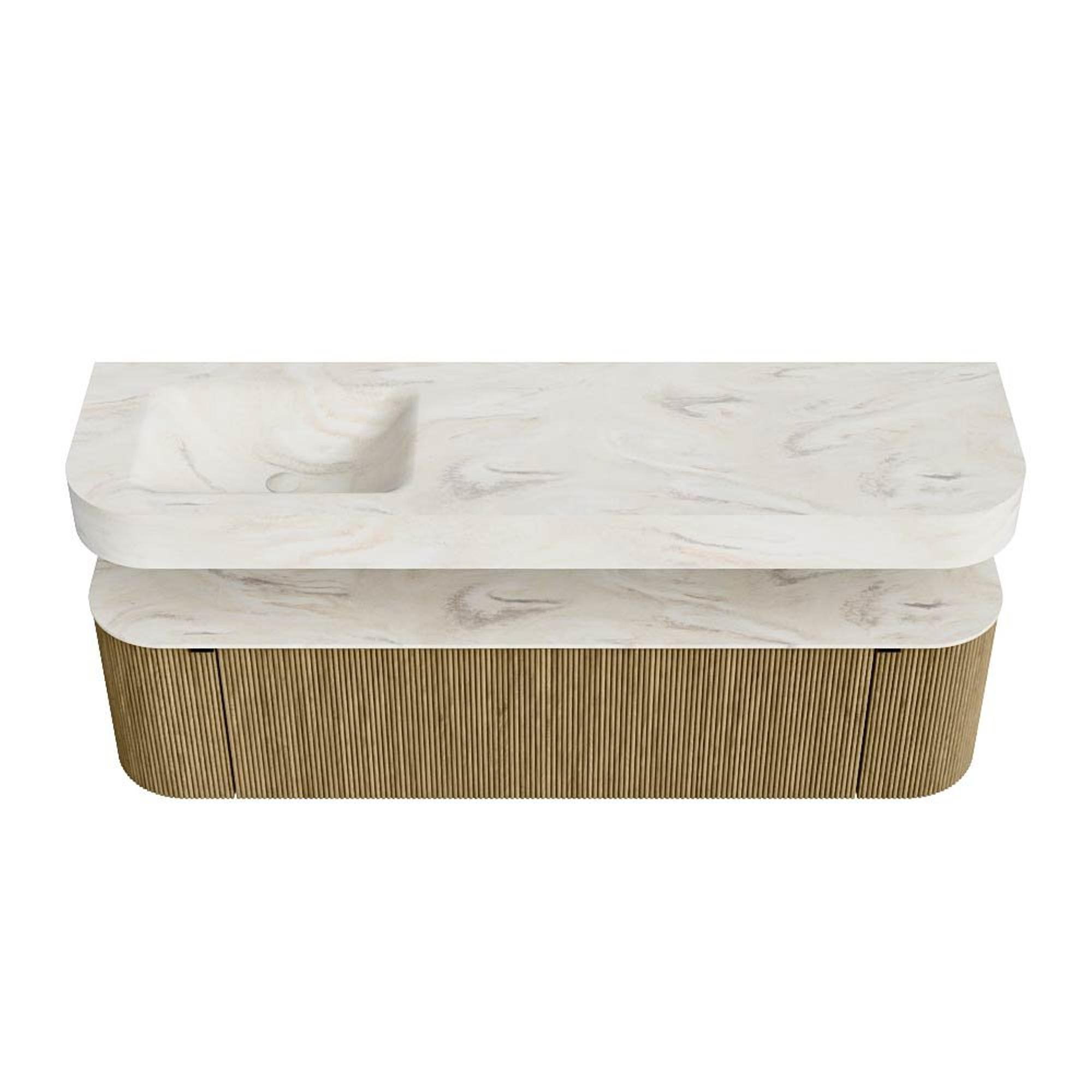 Boven het meubel zweeft een bijpassende, vrij hangende wastafel met afgeronde hoeken – perfect afgestemd op de vorm van de kast. De wastafel is uitgevoerd in Solid Surface en volgt subtiel de lijnen van het onderliggende meubel, waardoor een harmonieus geheel ontstaat. Het Solid Surface topblad vormt een sterke, onderhoudsvriendelijke basis en maakt de combinatie compleet.