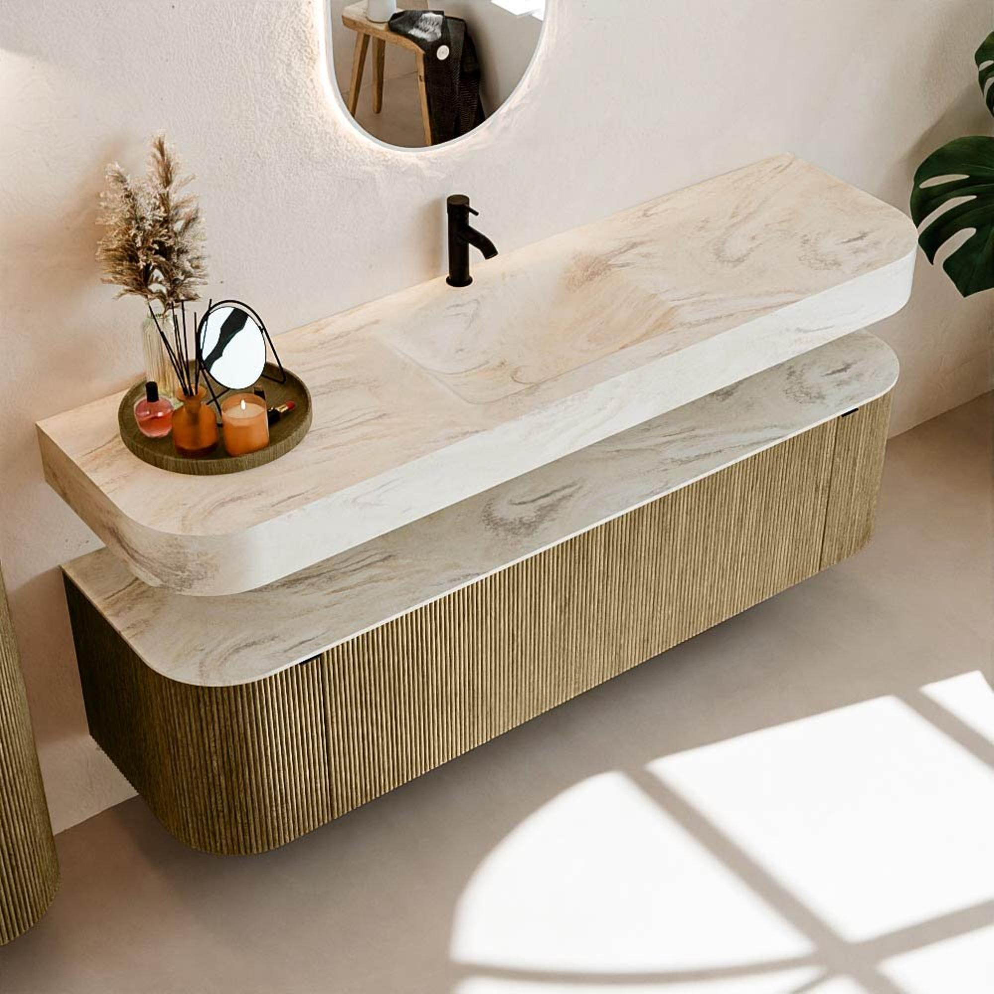 Boven het meubel zweeft een bijpassende, vrij hangende wastafel met afgeronde hoeken – perfect afgestemd op de vorm van de kast. De wastafel is uitgevoerd in Solid Surface en volgt subtiel de lijnen van het onderliggende meubel, waardoor een harmonieus geheel ontstaat. Het Solid Surface topblad vormt een sterke, onderhoudsvriendelijke basis en maakt de combinatie compleet.