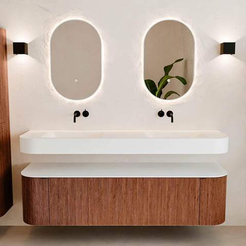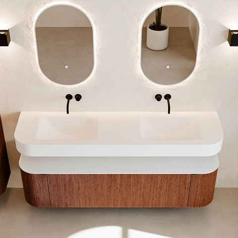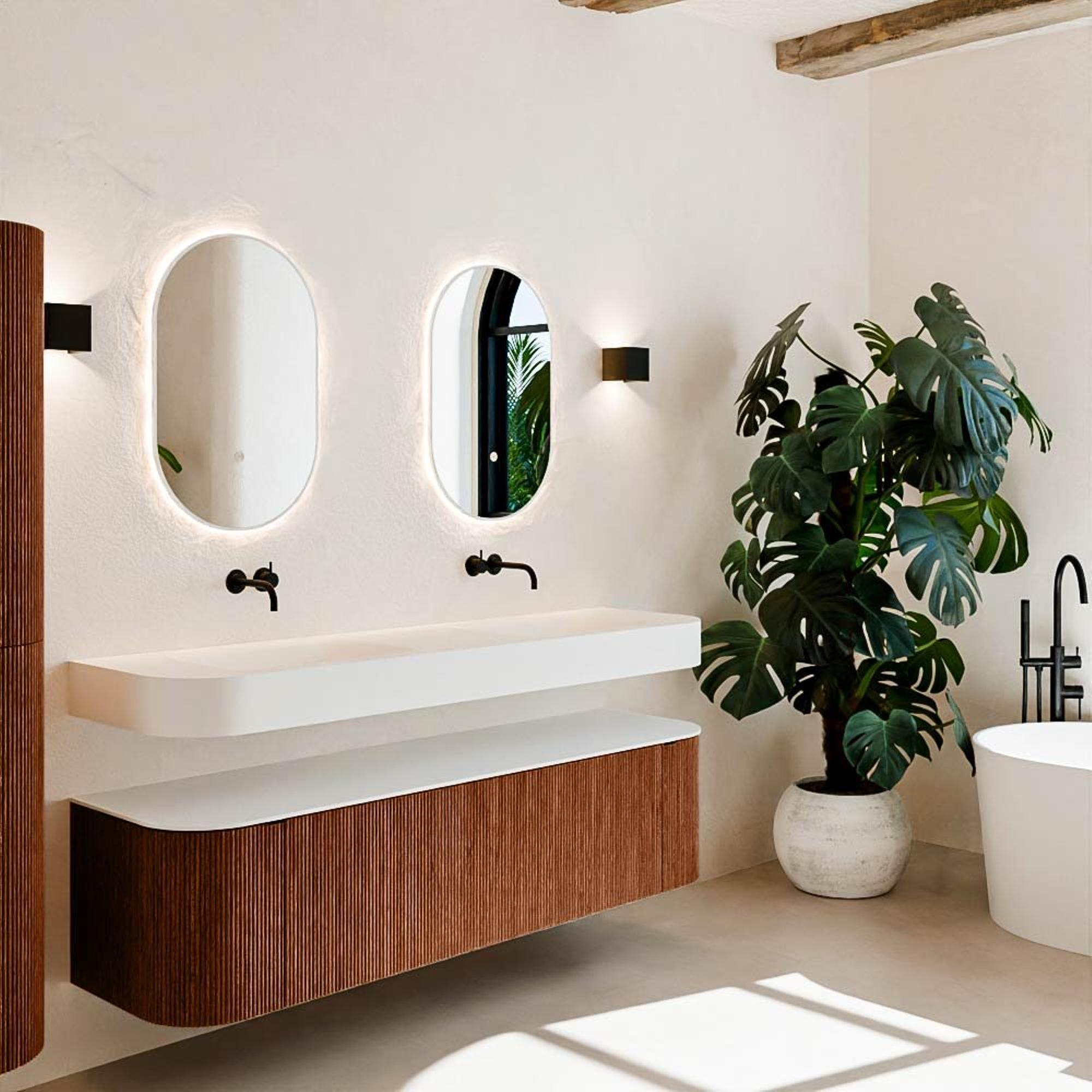 Natuurlijke materialen in warme tinten. De verticale ribbels brengen ritme en textuur in het ontwerp, terwijl het eikenhout zorgt voor een warme, ambachtelijke uitstraling. Kies uit 5 houttinten OAK, WALNUT, DUSK, SHADOW en RUBY zorgvuldig geselecteerde houtkleuren om zowel moderne als klassieke badkamers te verrijken.