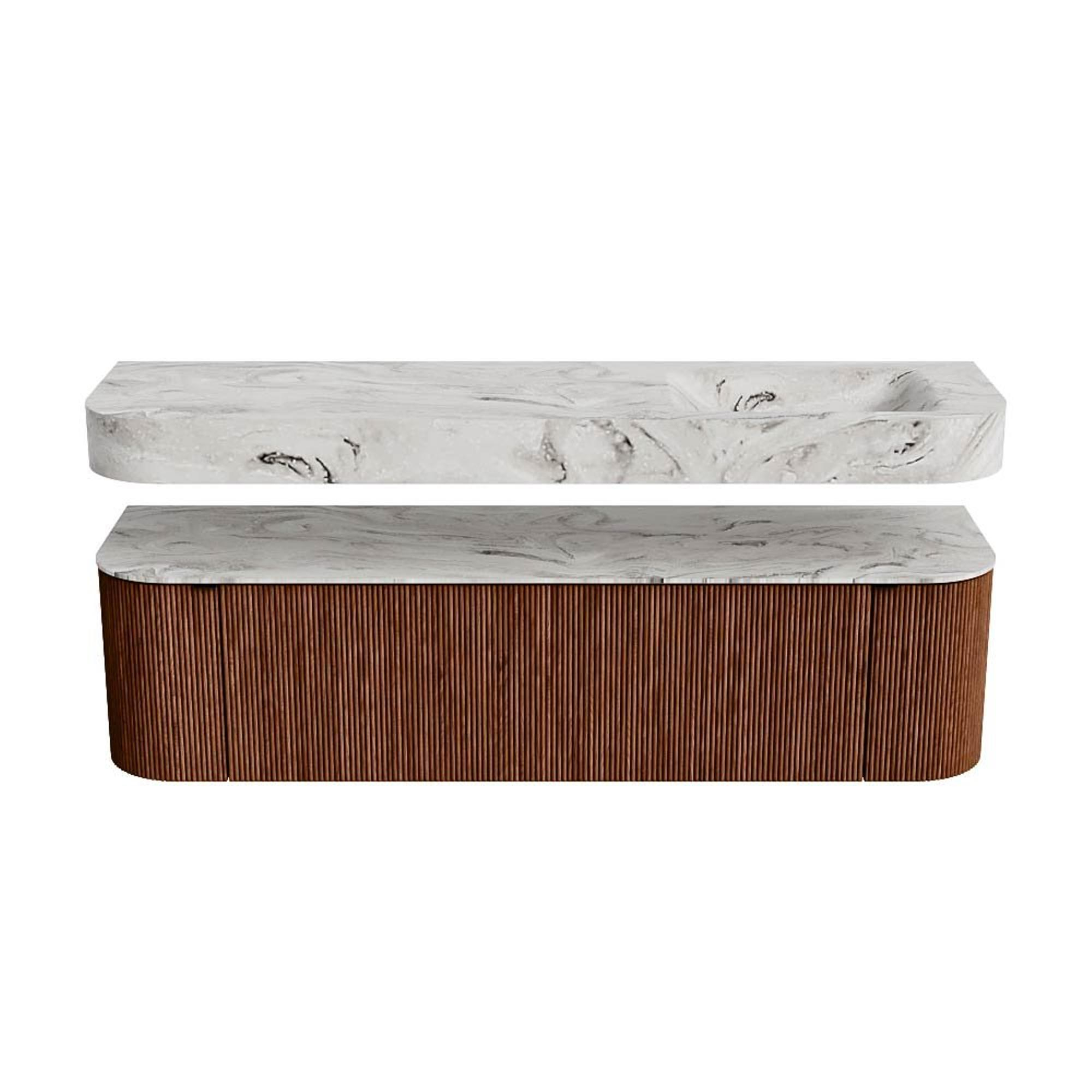 Boven het meubel zweeft een bijpassende, vrij hangende wastafel met afgeronde hoeken – perfect afgestemd op de vorm van de kast. De wastafel is uitgevoerd in Solid Surface en volgt subtiel de lijnen van het onderliggende meubel, waardoor een harmonieus geheel ontstaat. Het Solid Surface topblad vormt een sterke, onderhoudsvriendelijke basis en maakt de combinatie compleet.