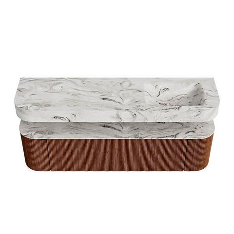Boven het meubel zweeft een bijpassende, vrij hangende wastafel met afgeronde hoeken – perfect afgestemd op de vorm van de kast. De wastafel is uitgevoerd in Solid Surface en volgt subtiel de lijnen van het onderliggende meubel, waardoor een harmonieus geheel ontstaat. Het Solid Surface topblad vormt een sterke, onderhoudsvriendelijke basis en maakt de combinatie compleet.