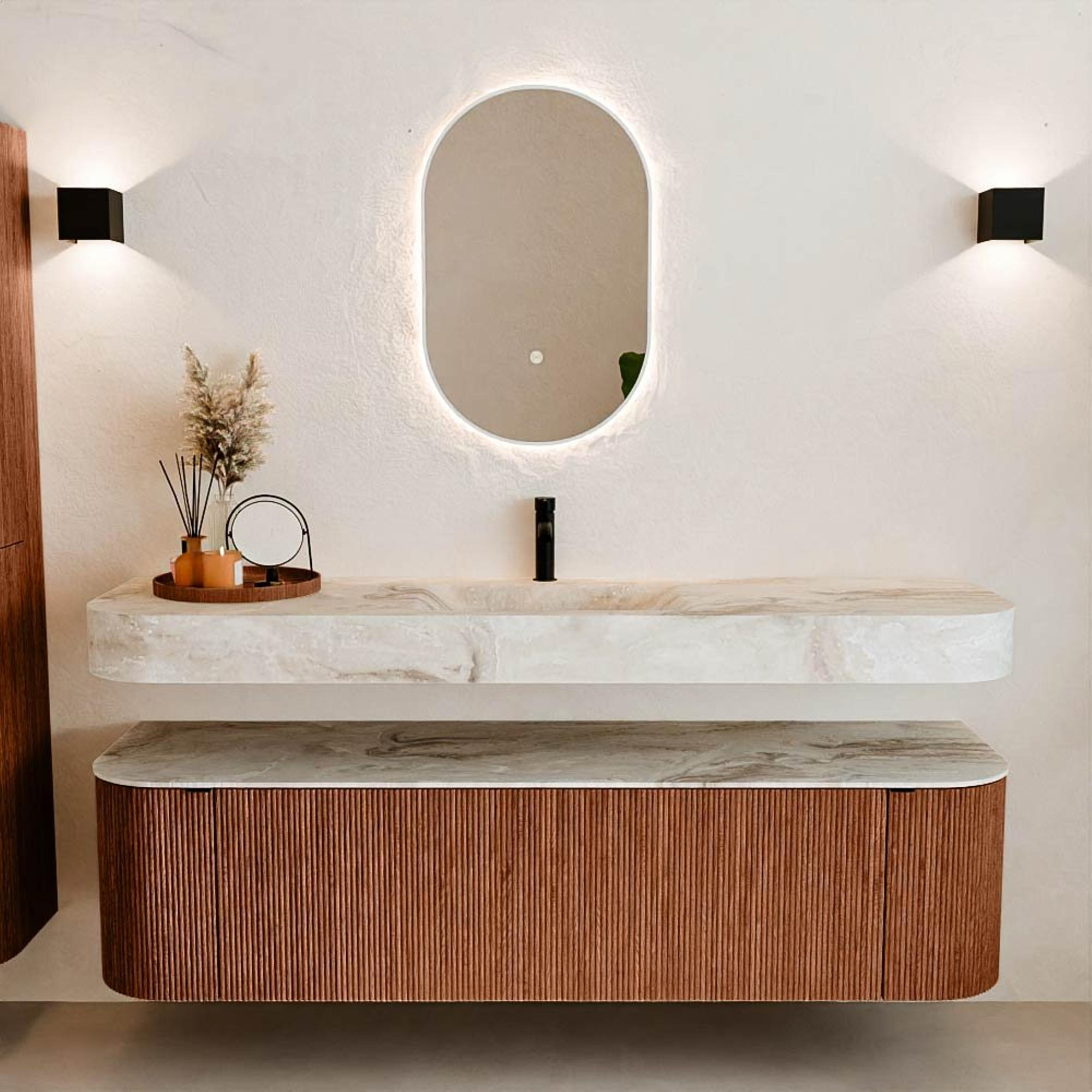 Natuurlijke materialen in warme tinten. De verticale ribbels brengen ritme en textuur in het ontwerp, terwijl het eikenhout zorgt voor een warme, ambachtelijke uitstraling. Kies uit 5 houttinten OAK, WALNUT, DUSK, SHADOW en RUBY zorgvuldig geselecteerde houtkleuren om zowel moderne als klassieke badkamers te verrijken.