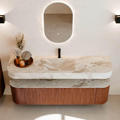 Boven het meubel zweeft een bijpassende, vrij hangende wastafel met afgeronde hoeken – perfect afgestemd op de vorm van de kast. De wastafel is uitgevoerd in Solid Surface en volgt subtiel de lijnen van het onderliggende meubel, waardoor een harmonieus geheel ontstaat. Het Solid Surface topblad vormt een sterke, onderhoudsvriendelijke basis en maakt de combinatie compleet.