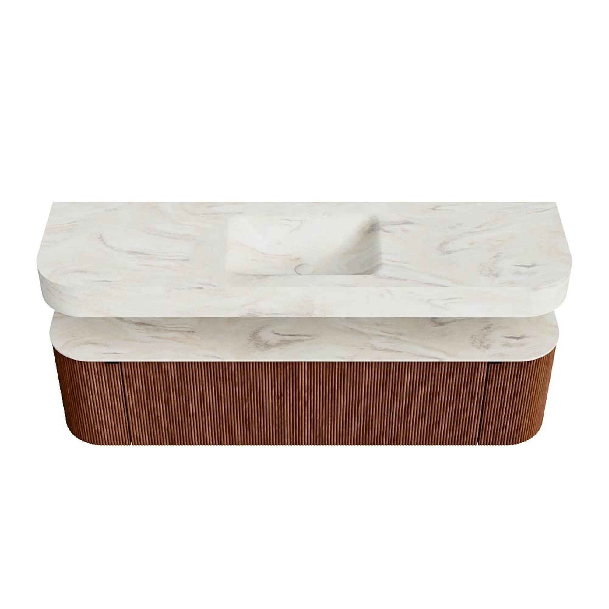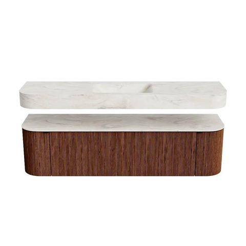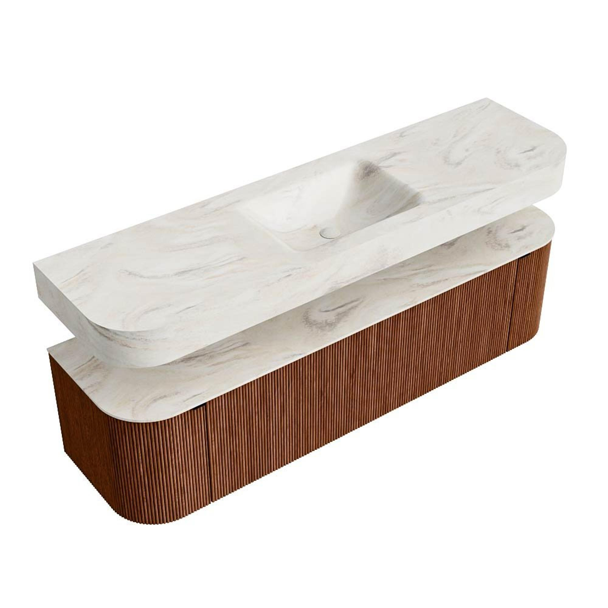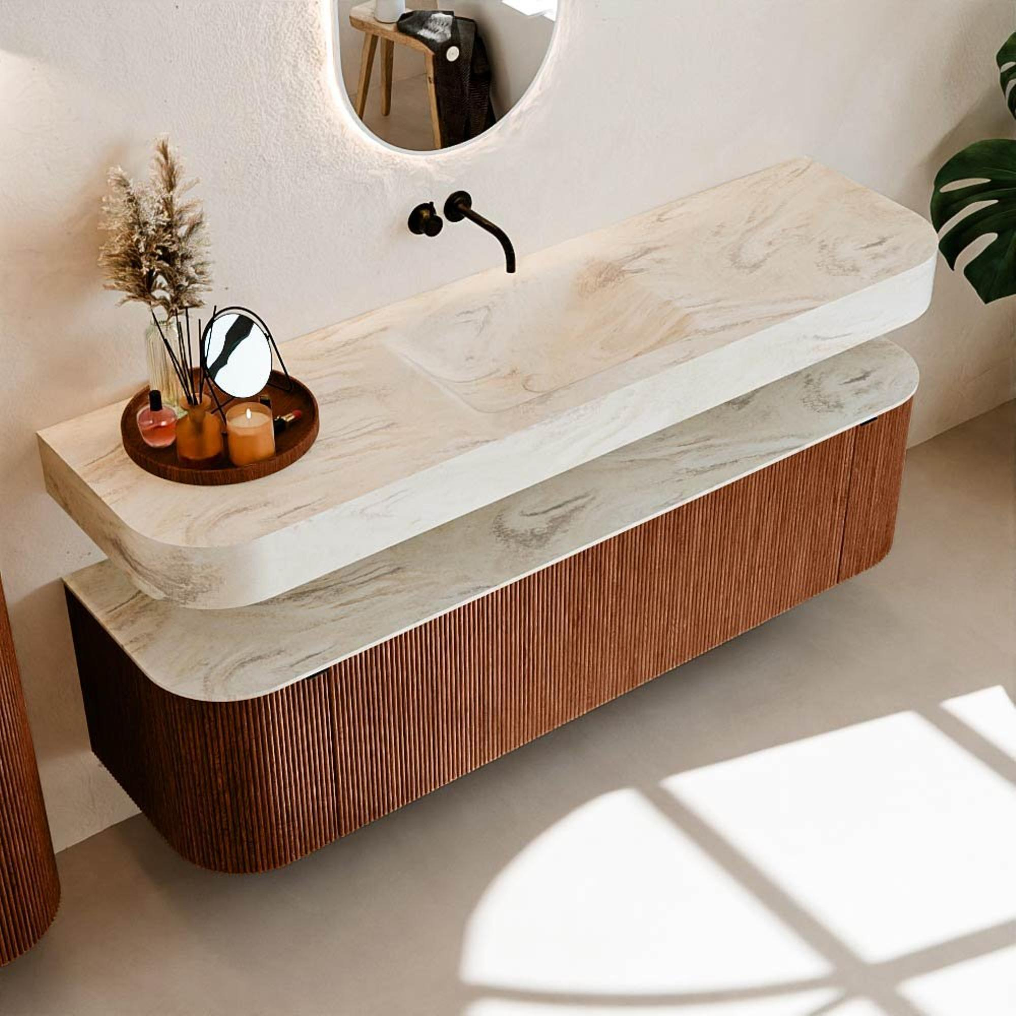 Boven het meubel zweeft een bijpassende, vrij hangende wastafel met afgeronde hoeken – perfect afgestemd op de vorm van de kast. De wastafel is uitgevoerd in Solid Surface en volgt subtiel de lijnen van het onderliggende meubel, waardoor een harmonieus geheel ontstaat. Het Solid Surface topblad vormt een sterke, onderhoudsvriendelijke basis en maakt de combinatie compleet.
