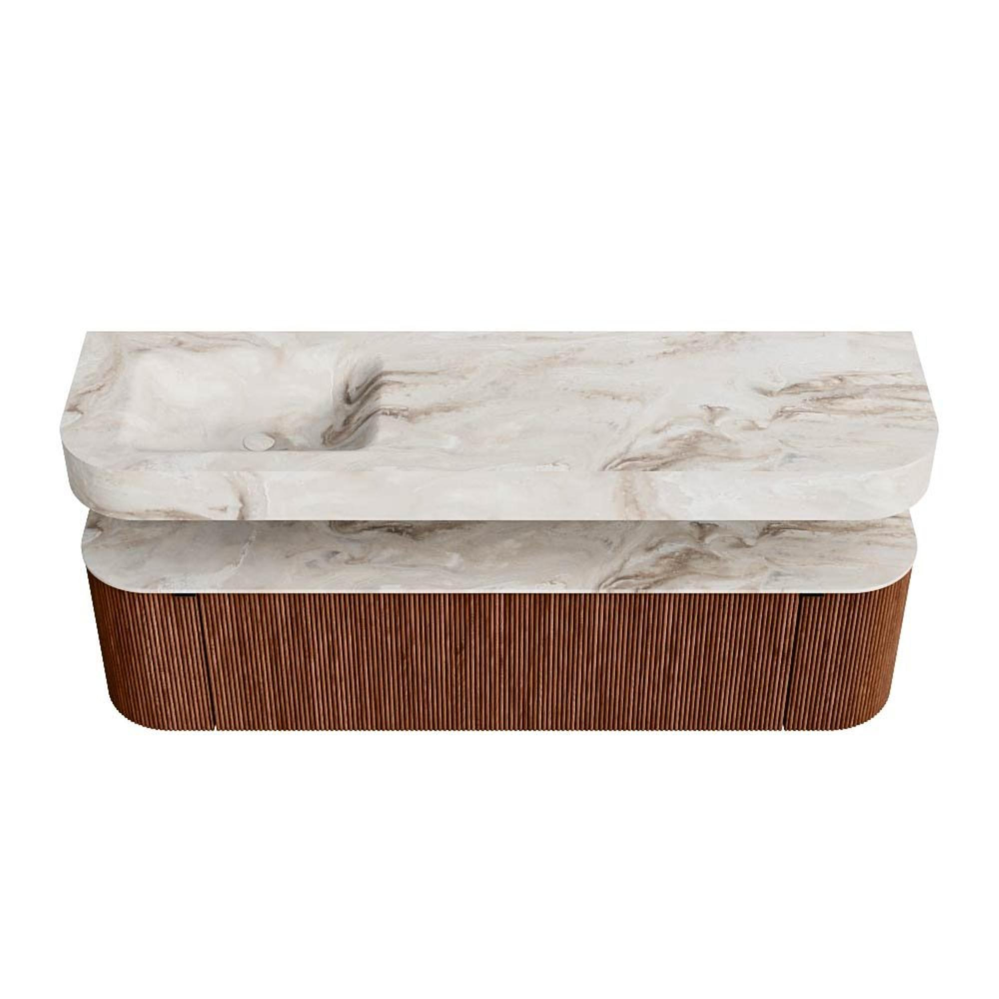 Boven het meubel zweeft een bijpassende, vrij hangende wastafel met afgeronde hoeken – perfect afgestemd op de vorm van de kast. De wastafel is uitgevoerd in Solid Surface en volgt subtiel de lijnen van het onderliggende meubel, waardoor een harmonieus geheel ontstaat. Het Solid Surface topblad vormt een sterke, onderhoudsvriendelijke basis en maakt de combinatie compleet.