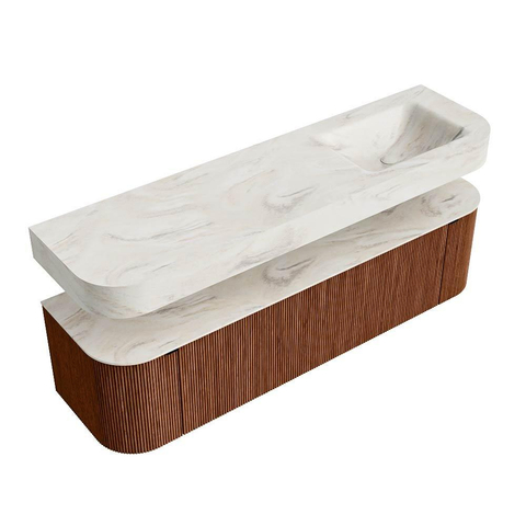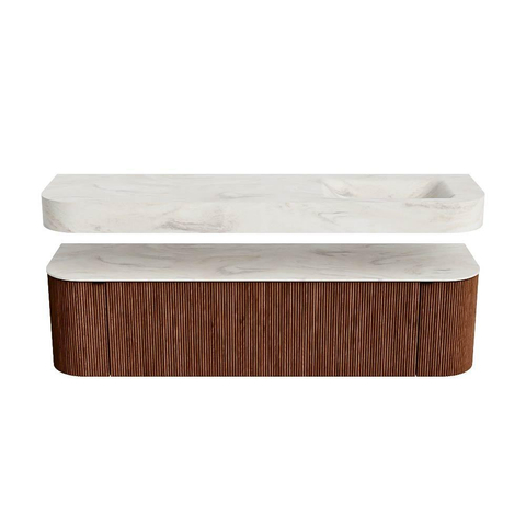 Boven het meubel zweeft een bijpassende, vrij hangende wastafel met afgeronde hoeken – perfect afgestemd op de vorm van de kast. De wastafel is uitgevoerd in Solid Surface en volgt subtiel de lijnen van het onderliggende meubel, waardoor een harmonieus geheel ontstaat. Het Solid Surface topblad vormt een sterke, onderhoudsvriendelijke basis en maakt de combinatie compleet.
