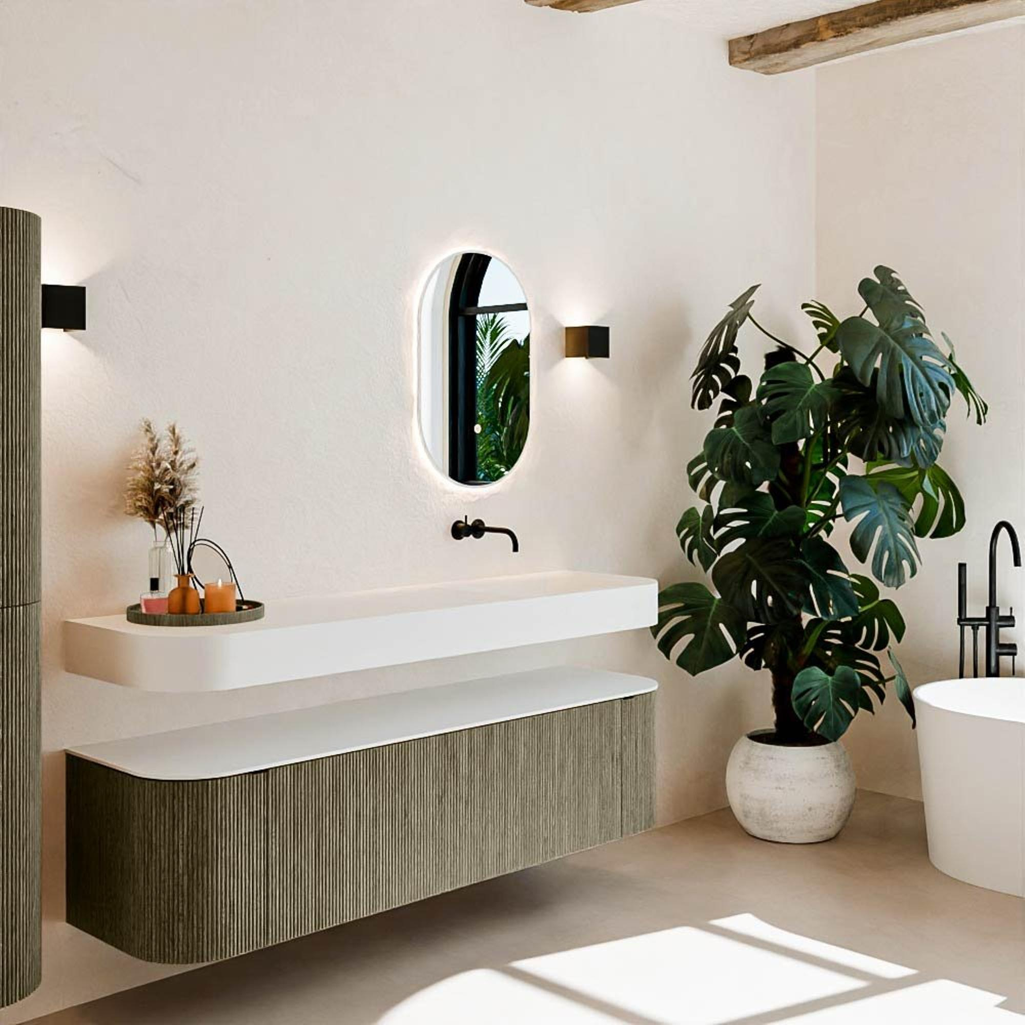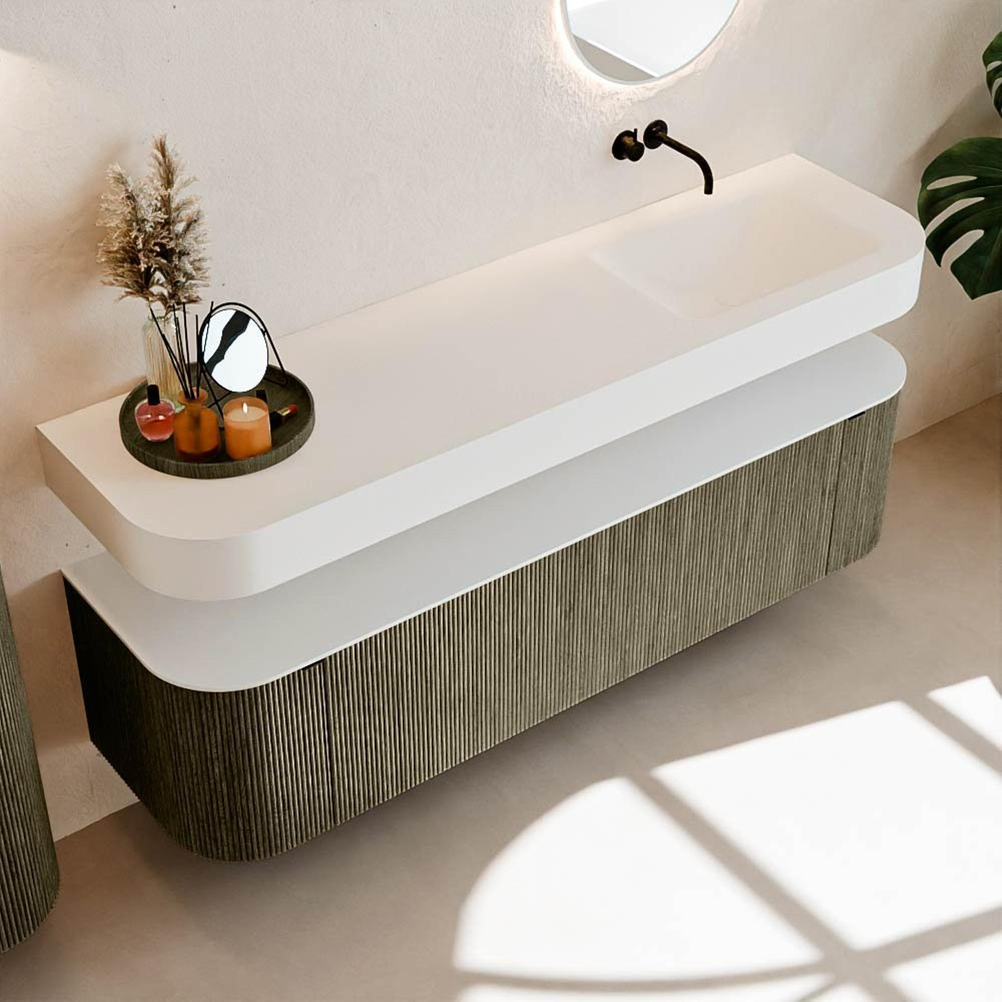 Boven het meubel zweeft een bijpassende, vrij hangende wastafel met afgeronde hoeken – perfect afgestemd op de vorm van de kast. De wastafel is uitgevoerd in Solid Surface en volgt subtiel de lijnen van het onderliggende meubel, waardoor een harmonieus geheel ontstaat. Het Solid Surface topblad vormt een sterke, onderhoudsvriendelijke basis en maakt de combinatie compleet.