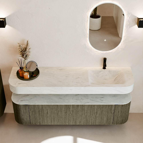 Boven het meubel zweeft een bijpassende, vrij hangende wastafel met afgeronde hoeken – perfect afgestemd op de vorm van de kast. De wastafel is uitgevoerd in Solid Surface en volgt subtiel de lijnen van het onderliggende meubel, waardoor een harmonieus geheel ontstaat. Het Solid Surface topblad vormt een sterke, onderhoudsvriendelijke basis en maakt de combinatie compleet.