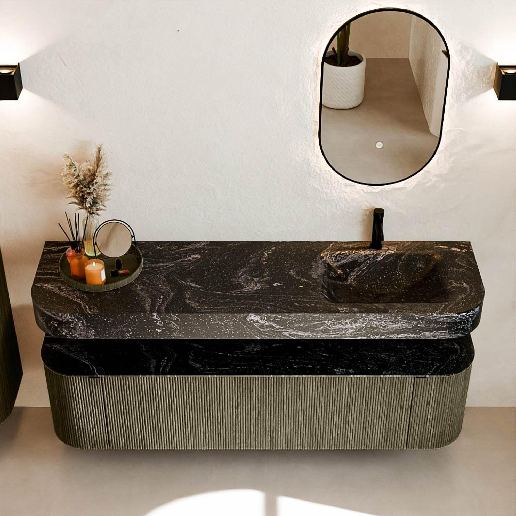MONDIAZ THOR-DLUX 170cm badmeubel ronding links + rechts kleur Shadow met 1 lade en 2 deuren. Vrijhangende wastafel CLOUD Rechts 1 kraangat kleur Lava.