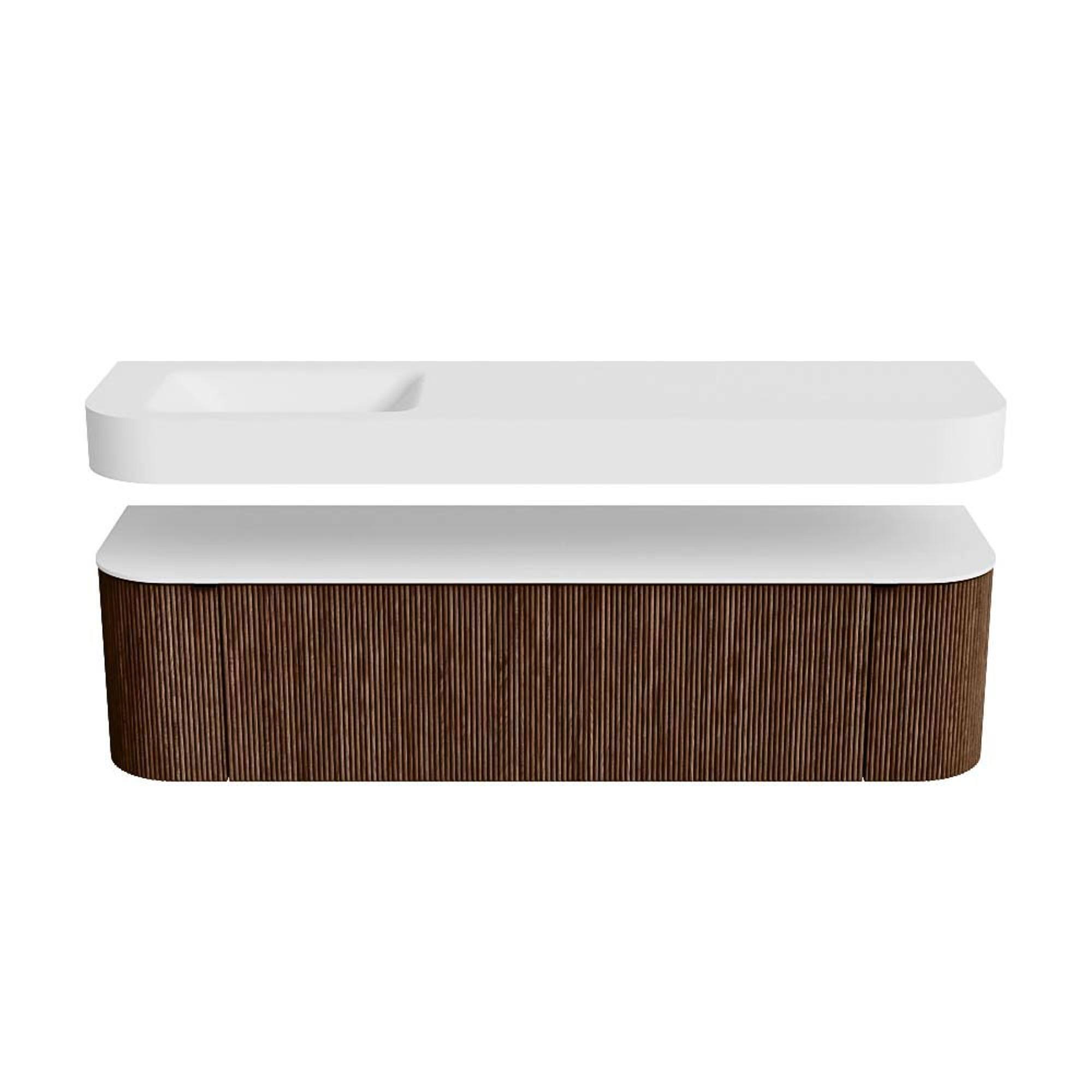 Boven het meubel zweeft een bijpassende, vrij hangende wastafel met afgeronde hoeken – perfect afgestemd op de vorm van de kast. De wastafel is uitgevoerd in Solid Surface en volgt subtiel de lijnen van het onderliggende meubel, waardoor een harmonieus geheel ontstaat. Het Solid Surface topblad vormt een sterke, onderhoudsvriendelijke basis en maakt de combinatie compleet.