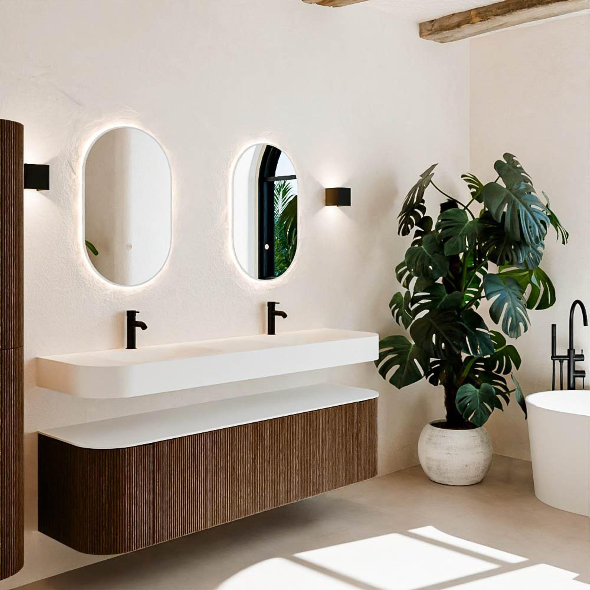 Natuurlijke materialen in warme tinten. De verticale ribbels brengen ritme en textuur in het ontwerp, terwijl het eikenhout zorgt voor een warme, ambachtelijke uitstraling. Kies uit 5 houttinten OAK, WALNUT, DUSK, SHADOW en RUBY zorgvuldig geselecteerde houtkleuren om zowel moderne als klassieke badkamers te verrijken.