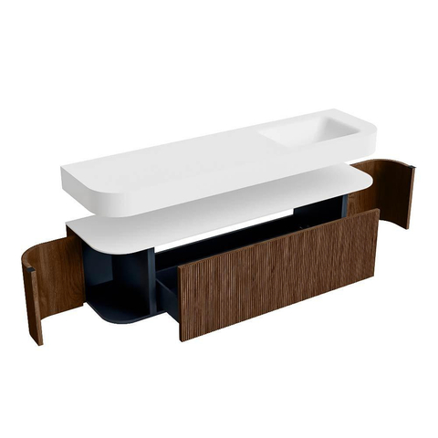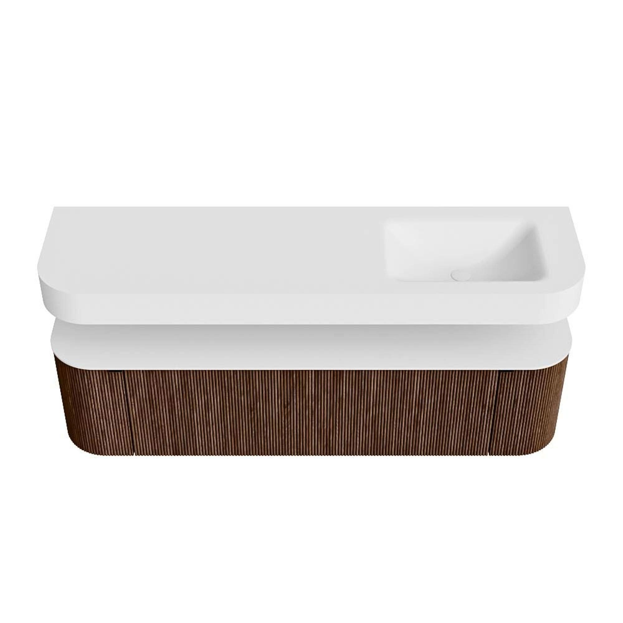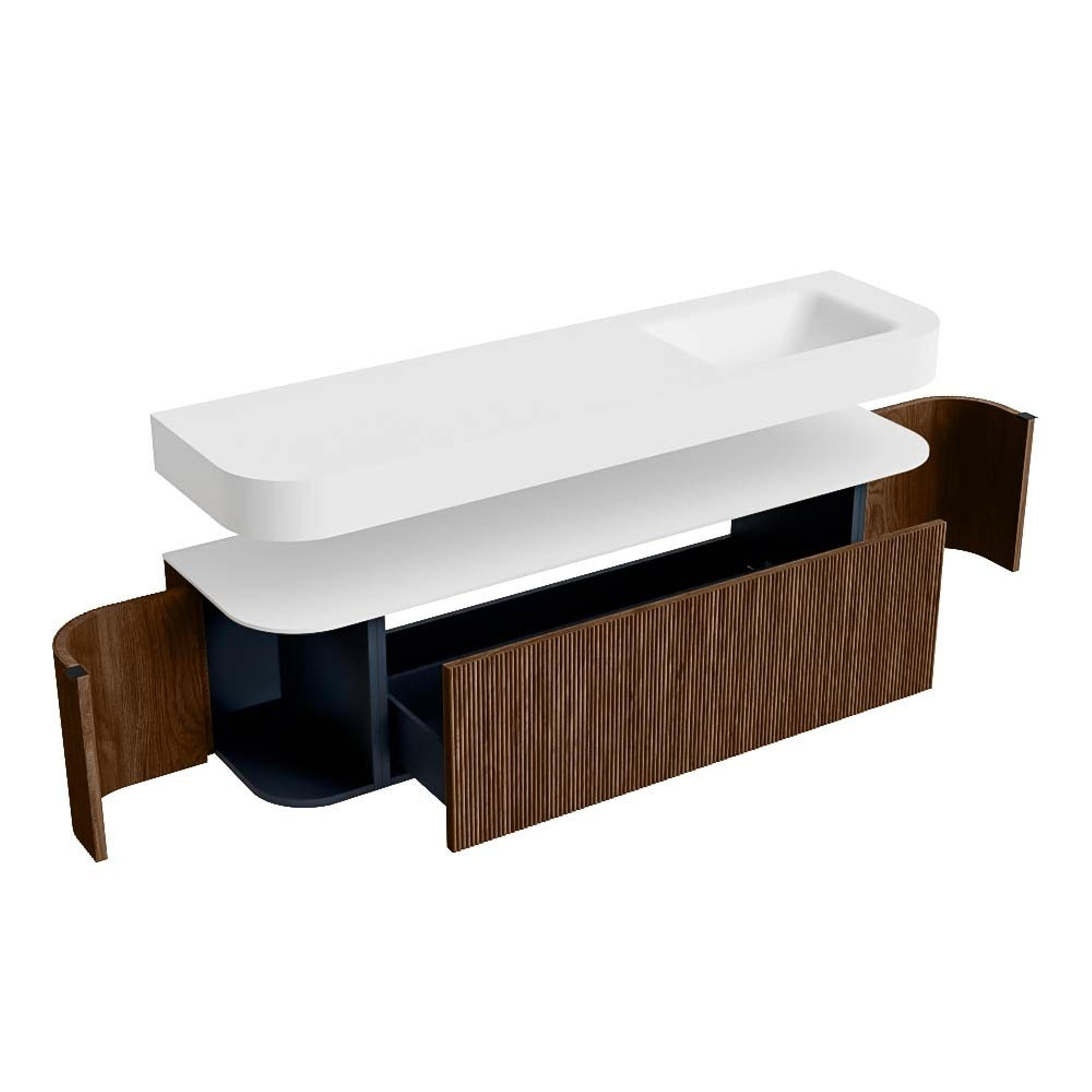 Boven het meubel zweeft een bijpassende, vrij hangende wastafel met afgeronde hoeken – perfect afgestemd op de vorm van de kast. De wastafel is uitgevoerd in Solid Surface en volgt subtiel de lijnen van het onderliggende meubel, waardoor een harmonieus geheel ontstaat. Het Solid Surface topblad vormt een sterke, onderhoudsvriendelijke basis en maakt de combinatie compleet.