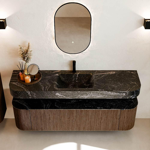MONDIAZ THOR-DLUX 170cm badmeubel ronding links + rechts kleur Walnut met 1 lade en 2 deuren. Vrijhangende wastafel CLOUD Midden 1 kraangat kleur Lava.