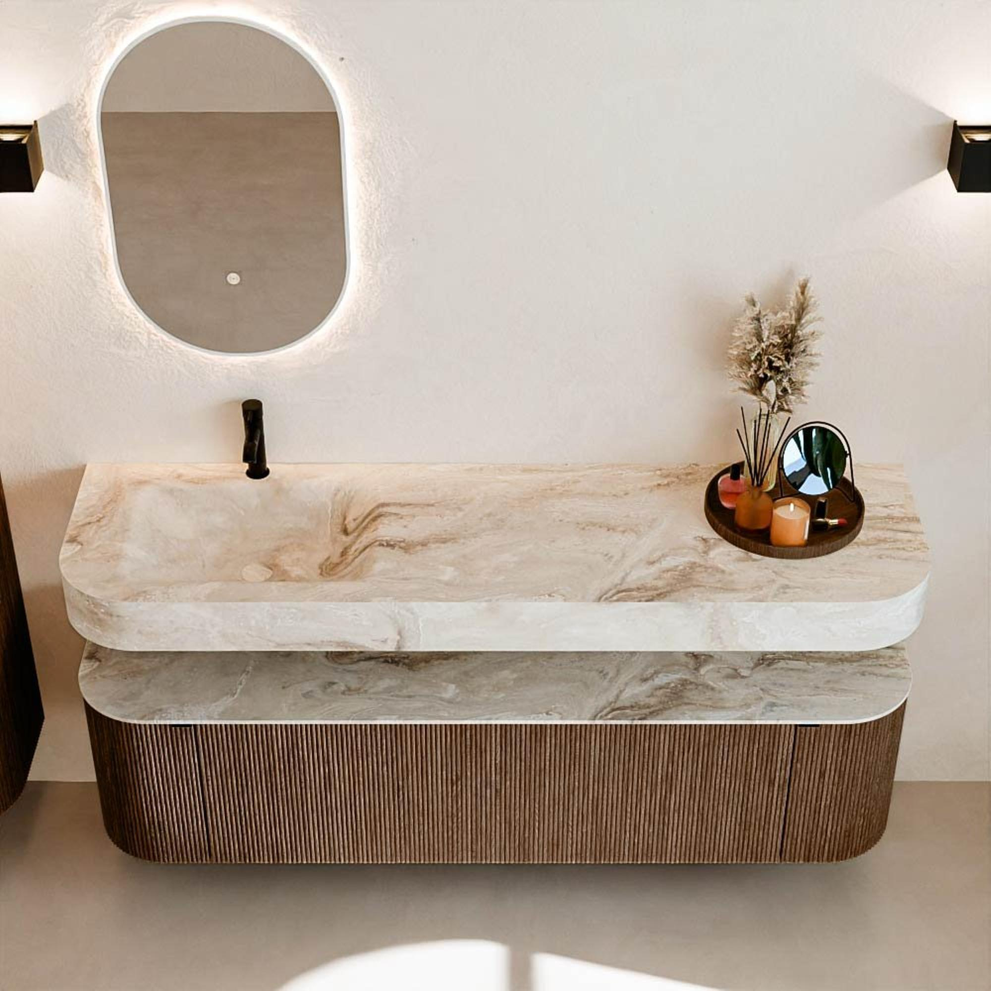 Natuurlijke materialen in warme tinten. De verticale ribbels brengen ritme en textuur in het ontwerp, terwijl het eikenhout zorgt voor een warme, ambachtelijke uitstraling. Kies uit 5 houttinten OAK, WALNUT, DUSK, SHADOW en RUBY zorgvuldig geselecteerde houtkleuren om zowel moderne als klassieke badkamers te verrijken.