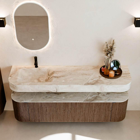 MONDIAZ THOR-DLUX 170cm badmeubel ronding links + rechts kleur Walnut met 1 lade en 2 deuren. Vrijhangende wastafel CLOUD Links 1 kraangat kleur Frappe.