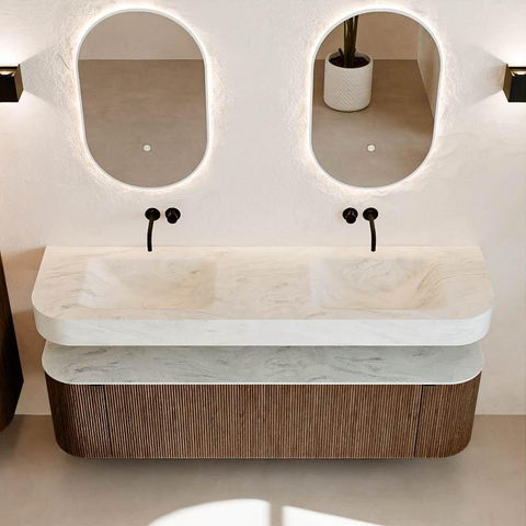 MONDIAZ THOR-DLUX 170cm badmeubel ronding links + rechts kleur Walnut met 1 lade en 2 deuren. Vrijhangende wastafel CLOUD Dubbel zonder kraangat kleur Opalo.
