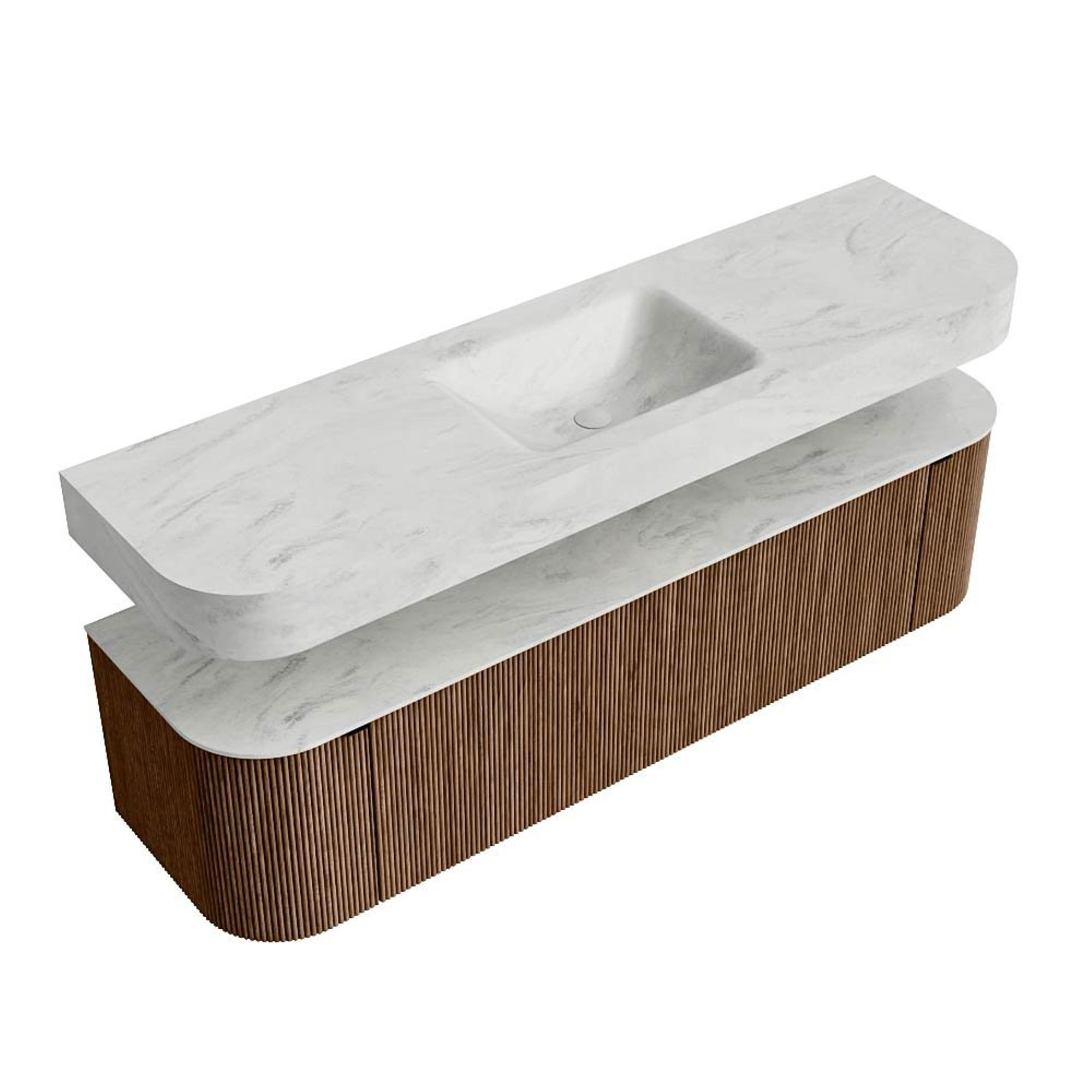 MONDIAZ THOR-DLUX 170cm badmeubel ronding links + rechts kleur Walnut met 1 lade en 2 deuren. Vrijhangende wastafel CLOUD Midden 1 kraangat kleur Opalo.