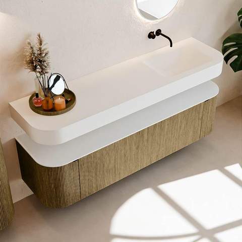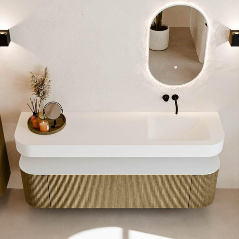 Boven het meubel zweeft een bijpassende, vrij hangende wastafel met afgeronde hoeken – perfect afgestemd op de vorm van de kast. De wastafel is uitgevoerd in Solid Surface en volgt subtiel de lijnen van het onderliggende meubel, waardoor een harmonieus geheel ontstaat. Het Solid Surface topblad vormt een sterke, onderhoudsvriendelijke basis en maakt de combinatie compleet.
