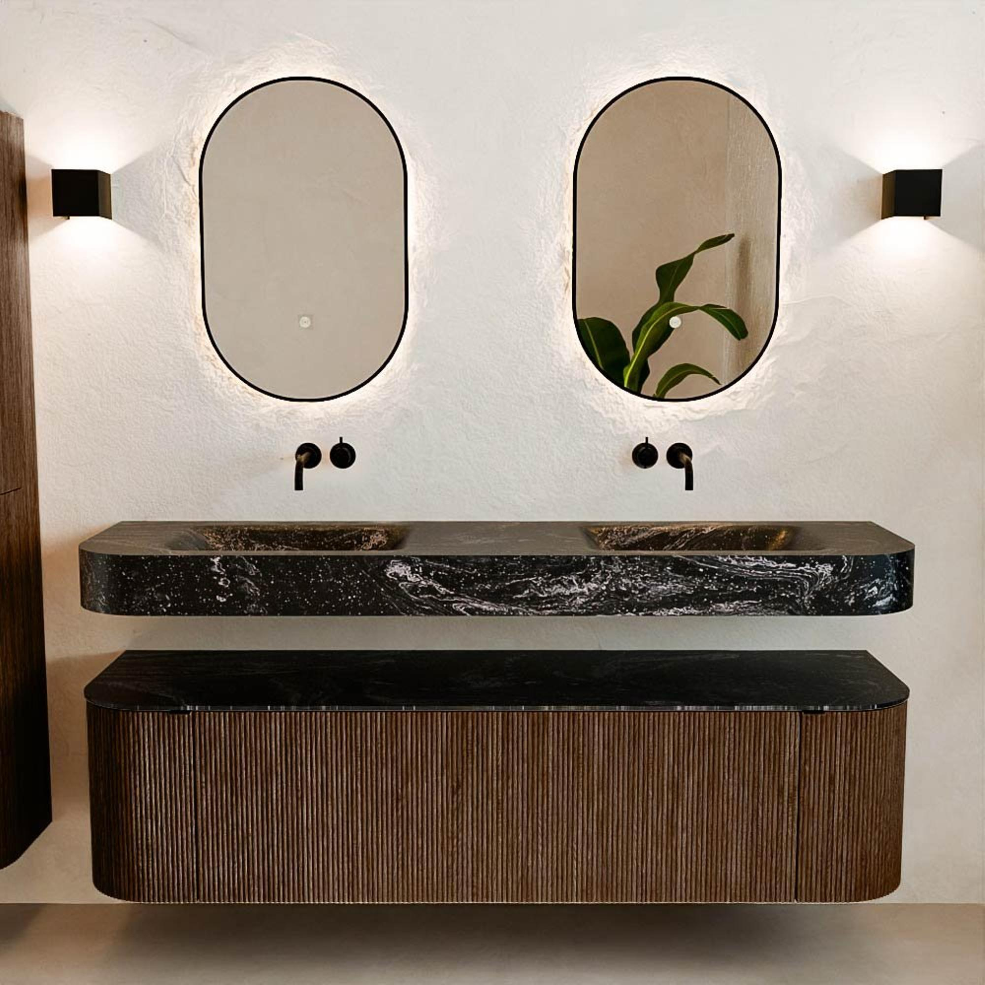 Natuurlijke materialen in warme tinten. De verticale ribbels brengen ritme en textuur in het ontwerp, terwijl het eikenhout zorgt voor een warme, ambachtelijke uitstraling. Kies uit 5 houttinten OAK, WALNUT, DUSK, SHADOW en RUBY zorgvuldig geselecteerde houtkleuren om zowel moderne als klassieke badkamers te verrijken.